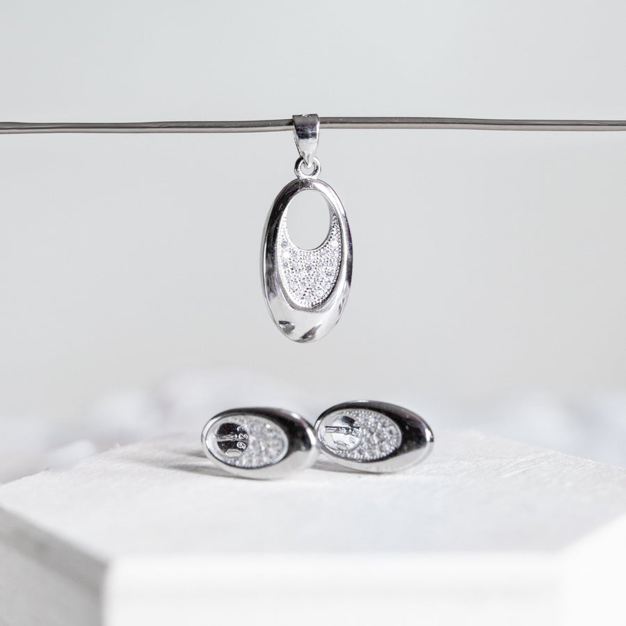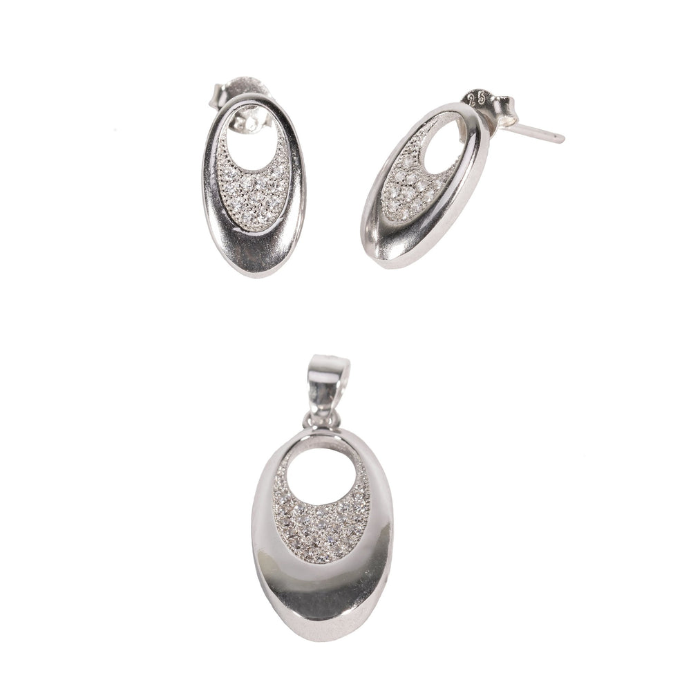 Aretes y dije de plata 925 ovalados con zirconias cúbicas blancas.