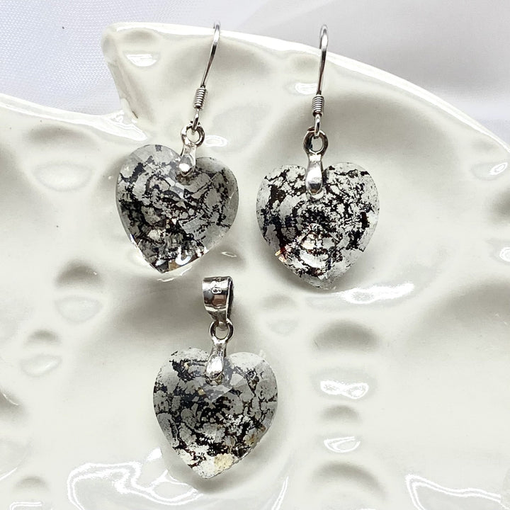 Hermoso juego de aretes y dije de plata con cristales Swarovski, en forma de corazones, de 15MM de tamaño, de color blanco con negro.