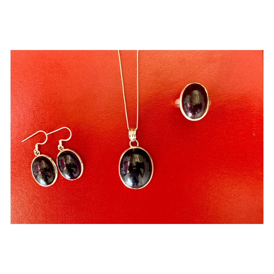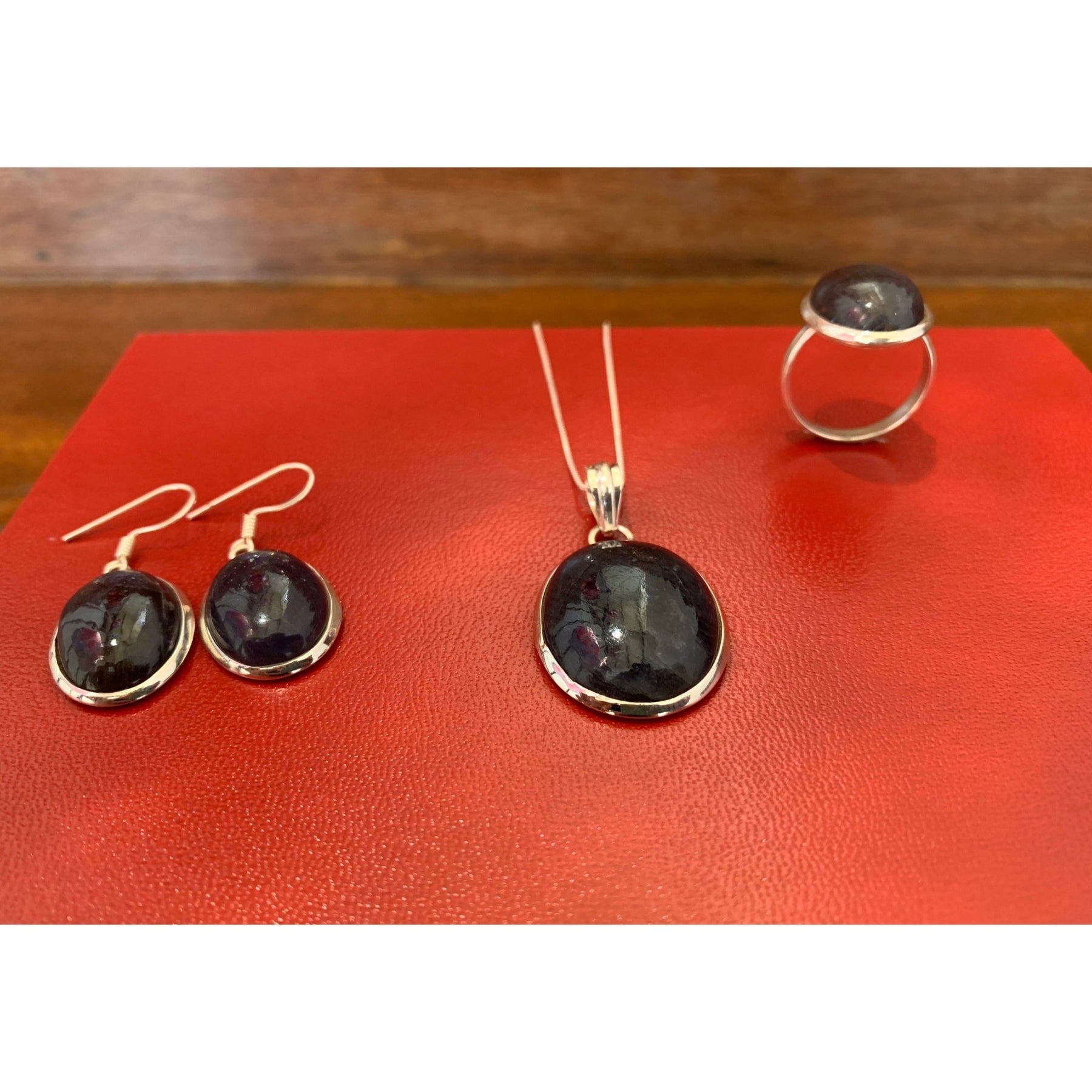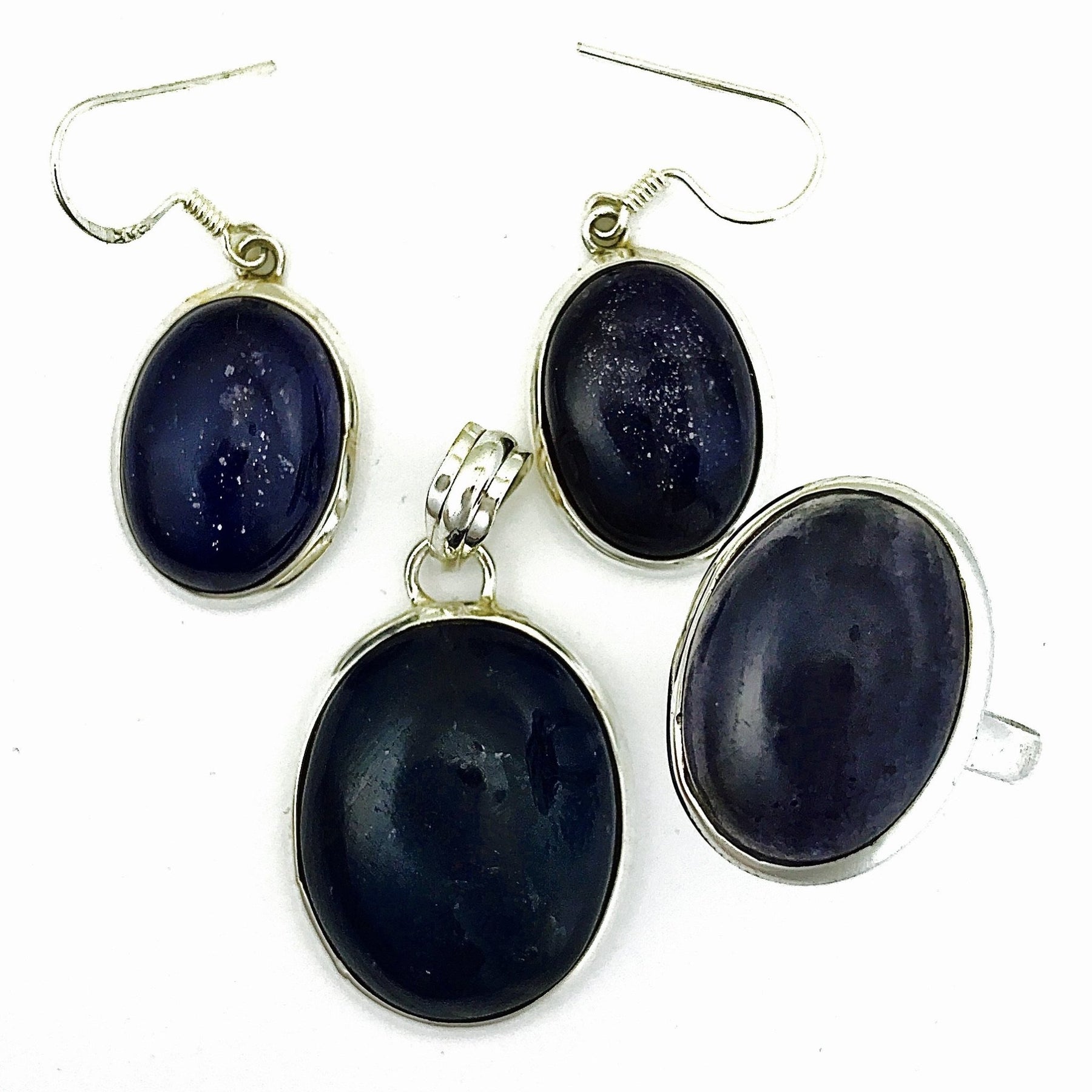 Juego de aretes, dije y anillo de Plata 925 con Piedra Semipreciosa Aventurina Azul. NO INCLUYE CADENA.