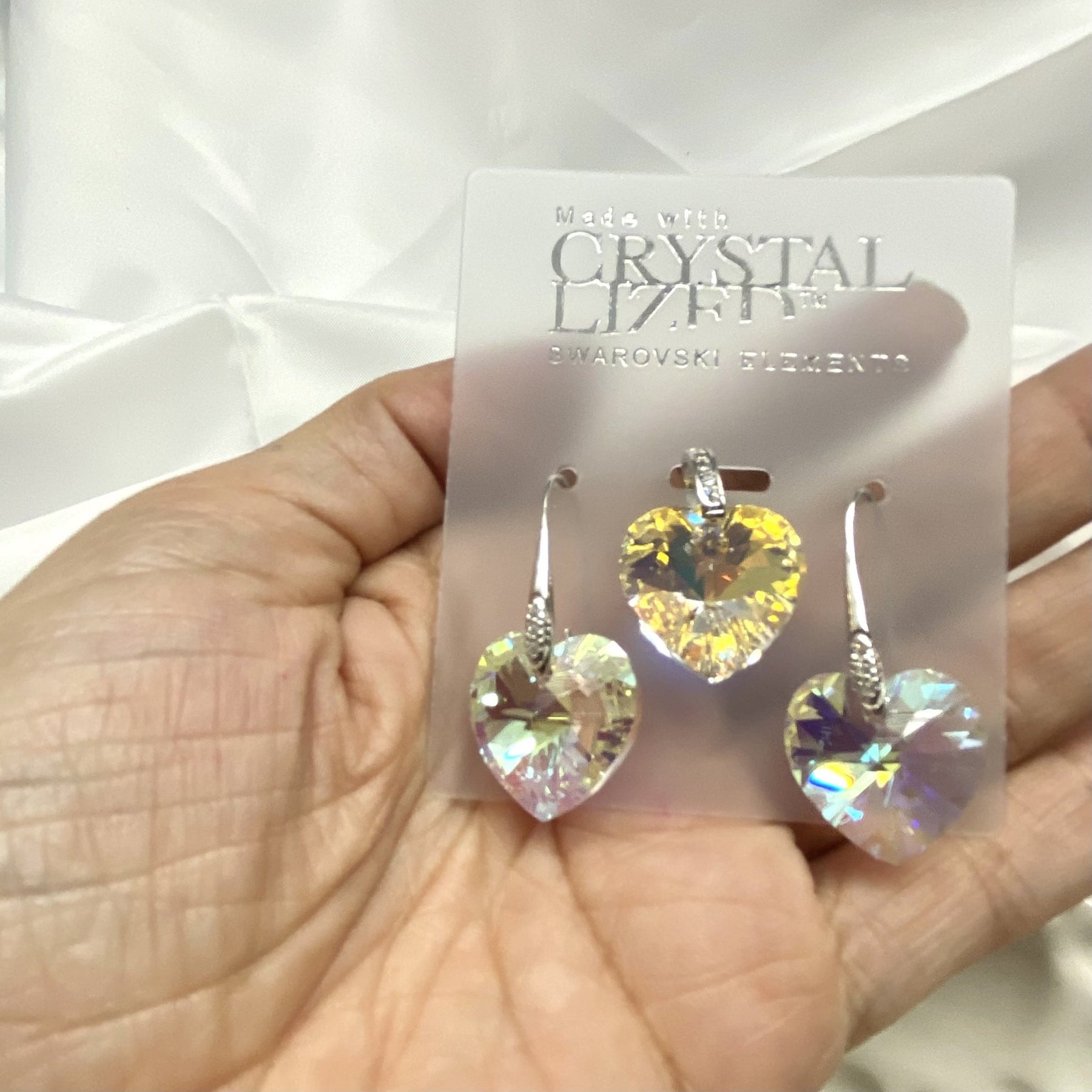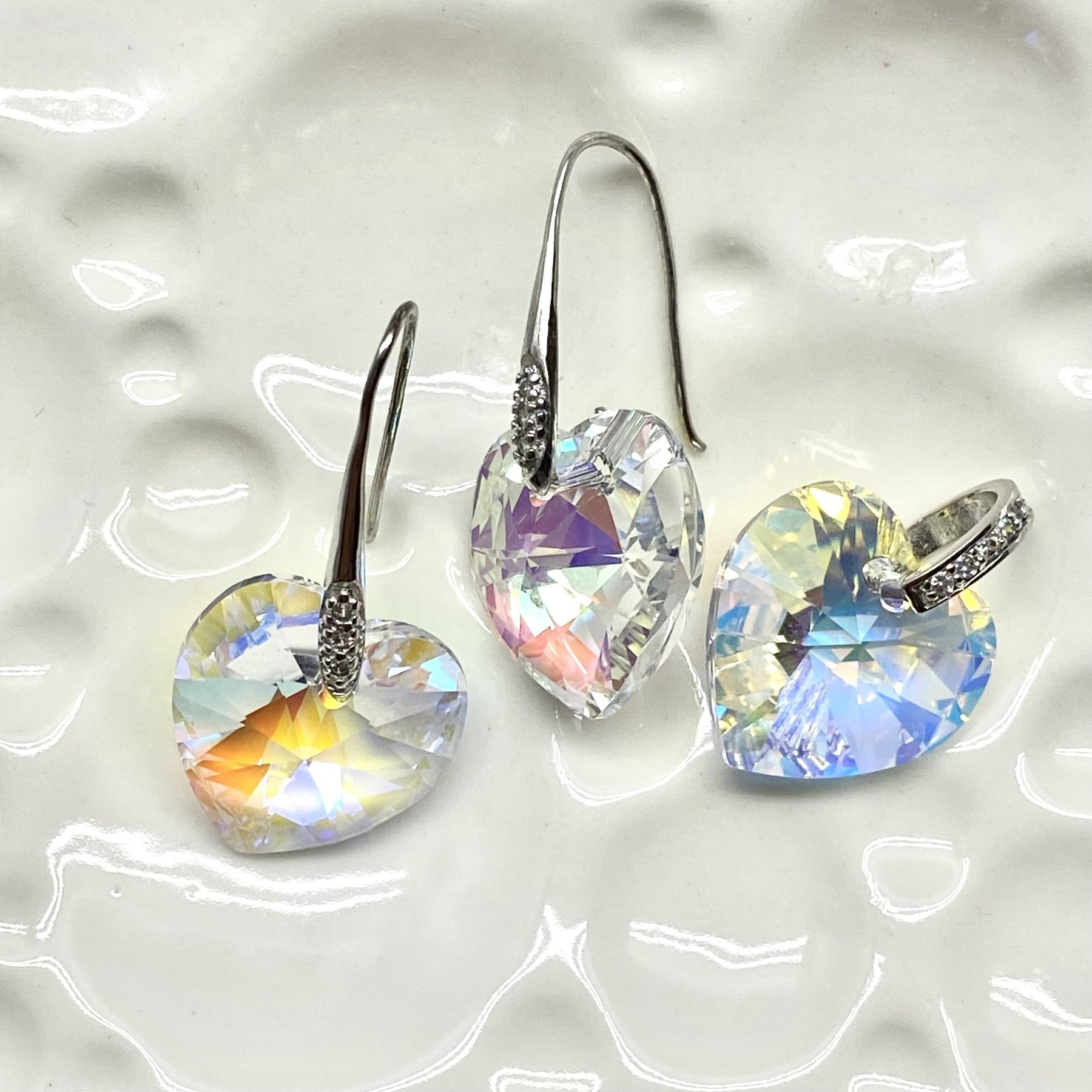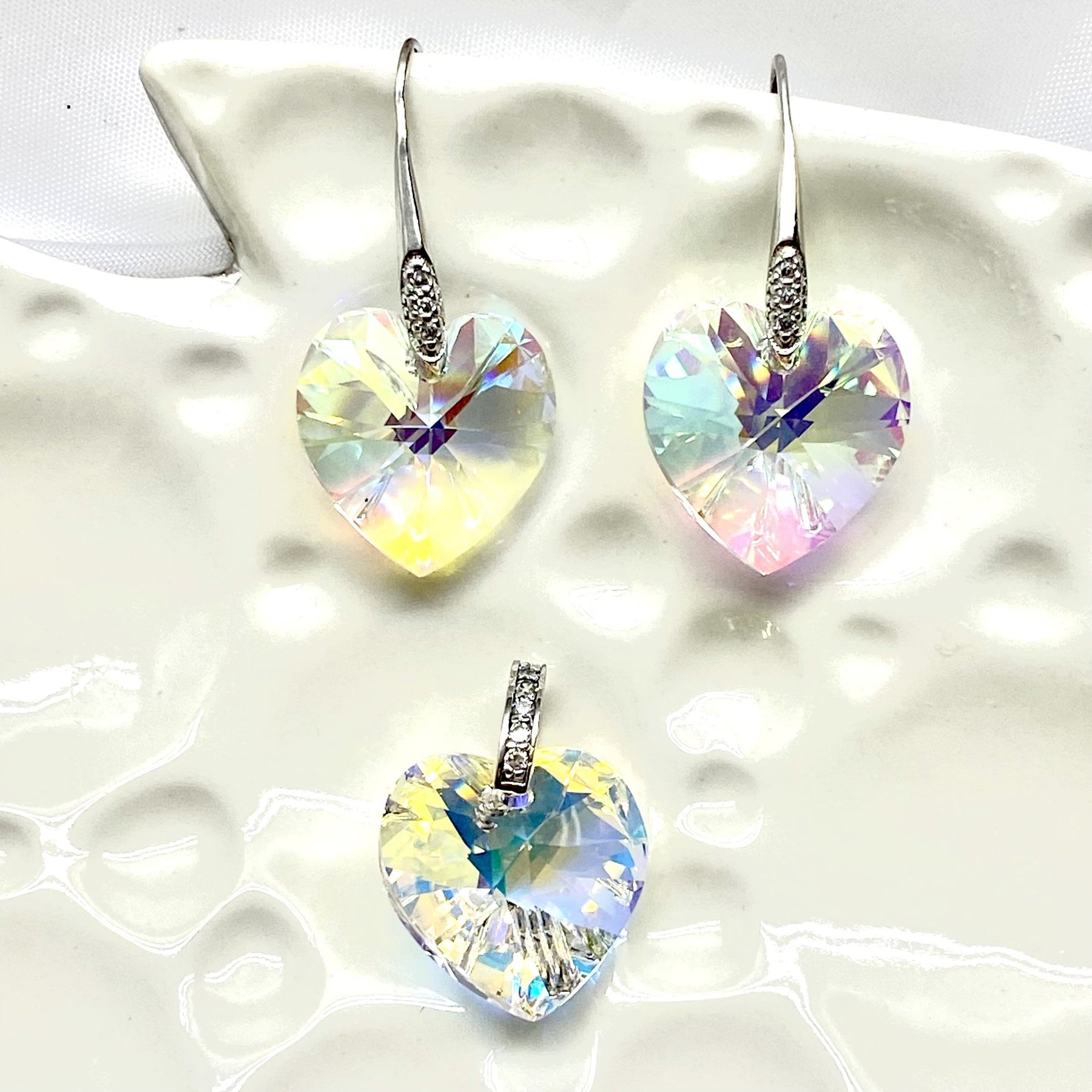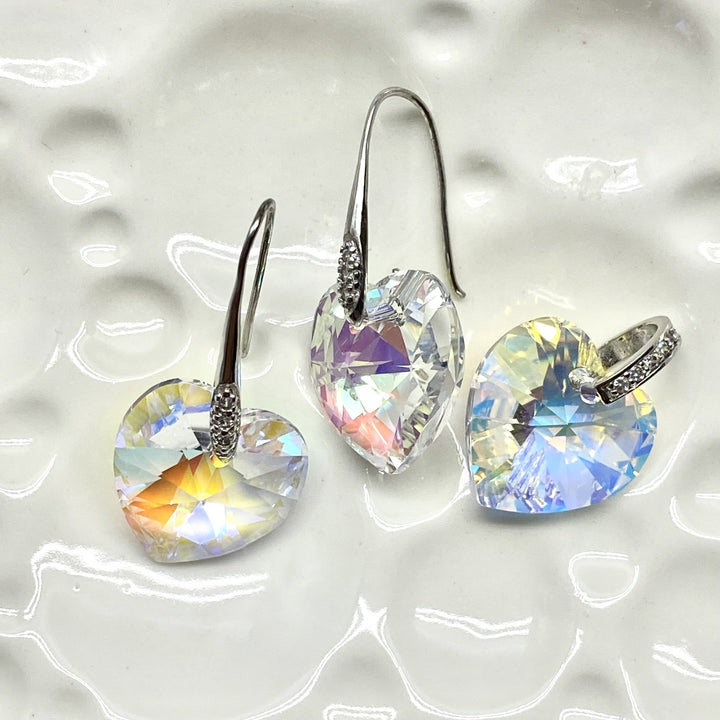 Hermoso juego de aretes y dije de plata con cristales Swarovski, en forma de corazones, de 17MM de tamaño, de color tornasol.