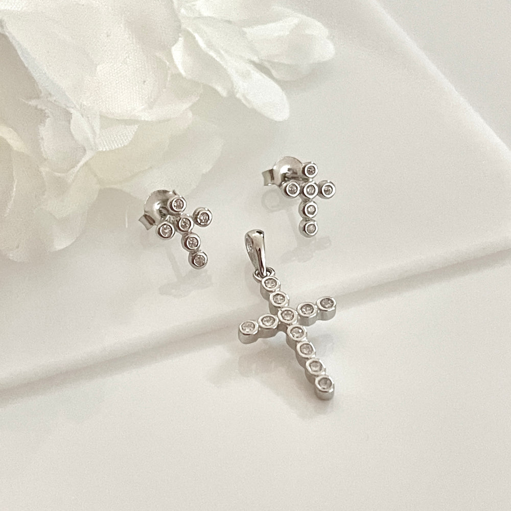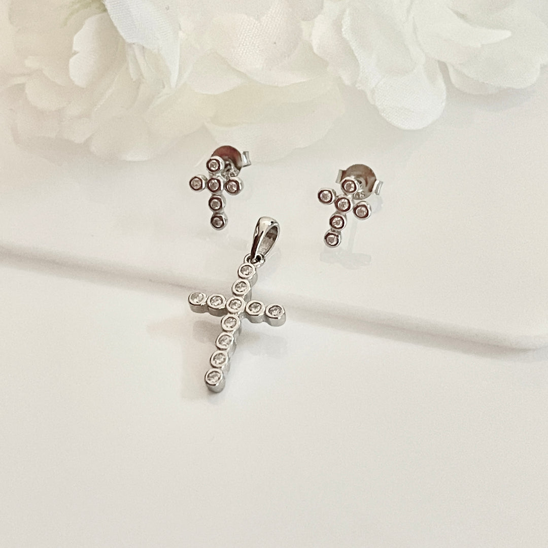 Te presentamos el Set de Plata, un hermoso y elegante conjunto de joyas que es un gran complemento para cualquier conjunto. Los aretes y el colgante están hechos de plata rodinada , y presentan un diseño de cruz fina. Los aretes tienen un tamaño de 10mm y el colgante de 19 mm. Este conjunto es perfecto para quienes quieren añadir un toque de elegancia a su look.