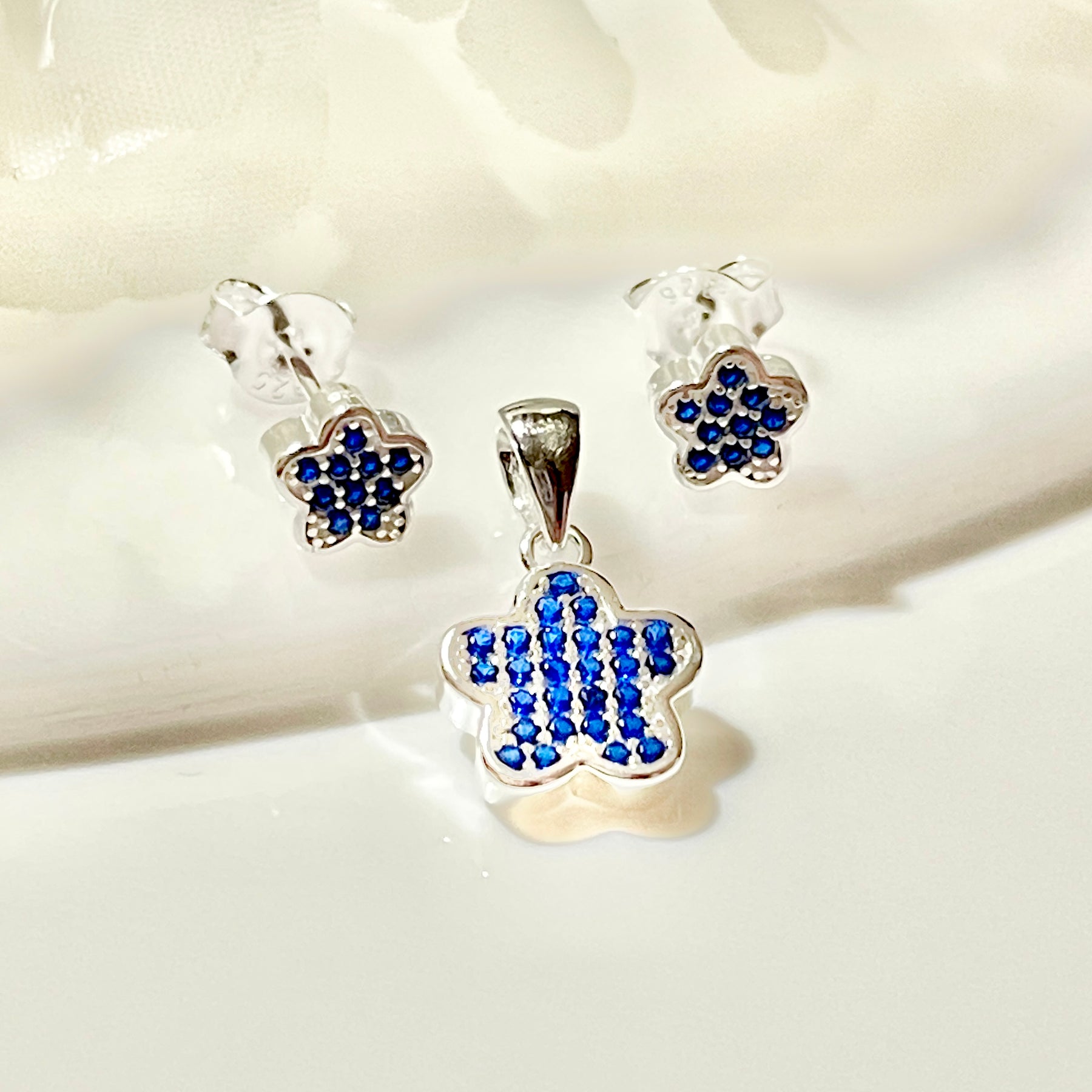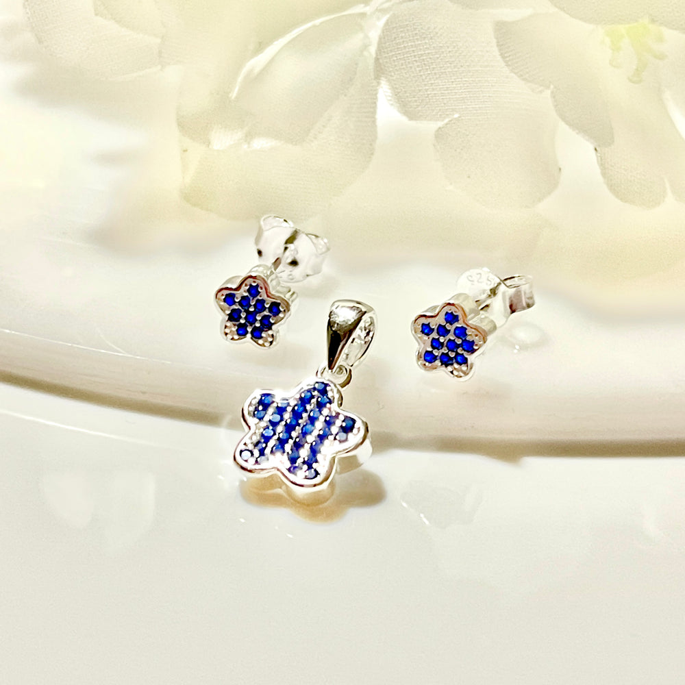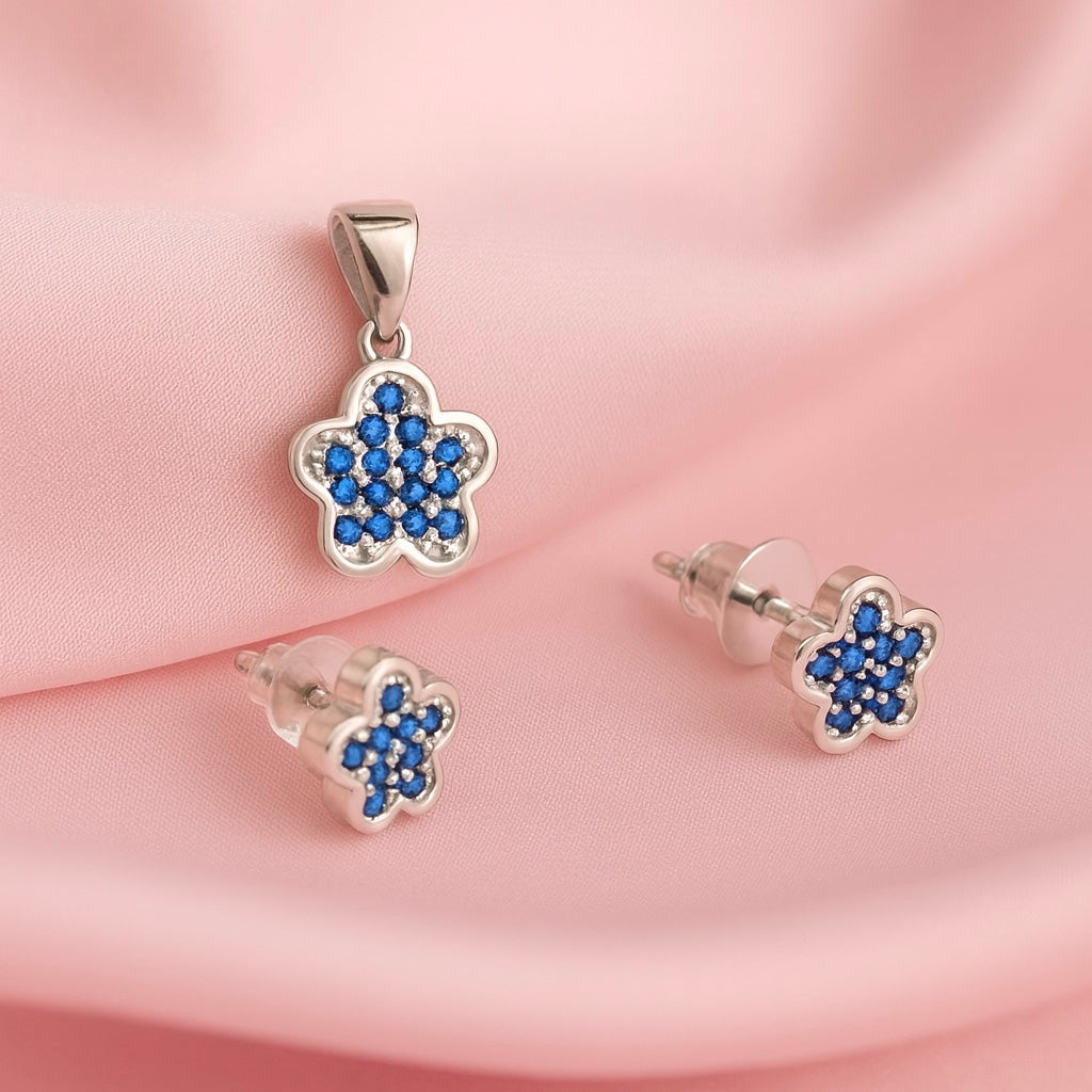 Juego Plata Flor Brillo Azul 🟦