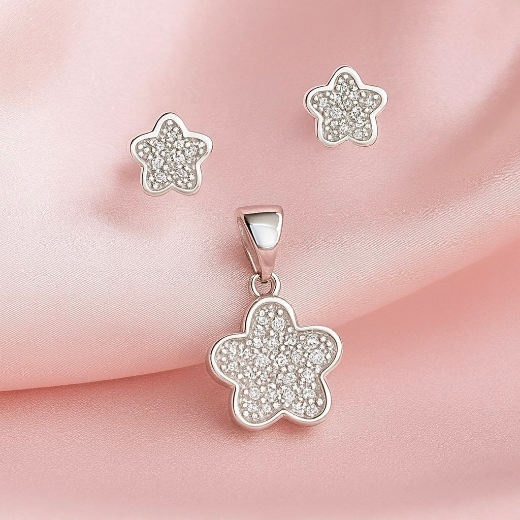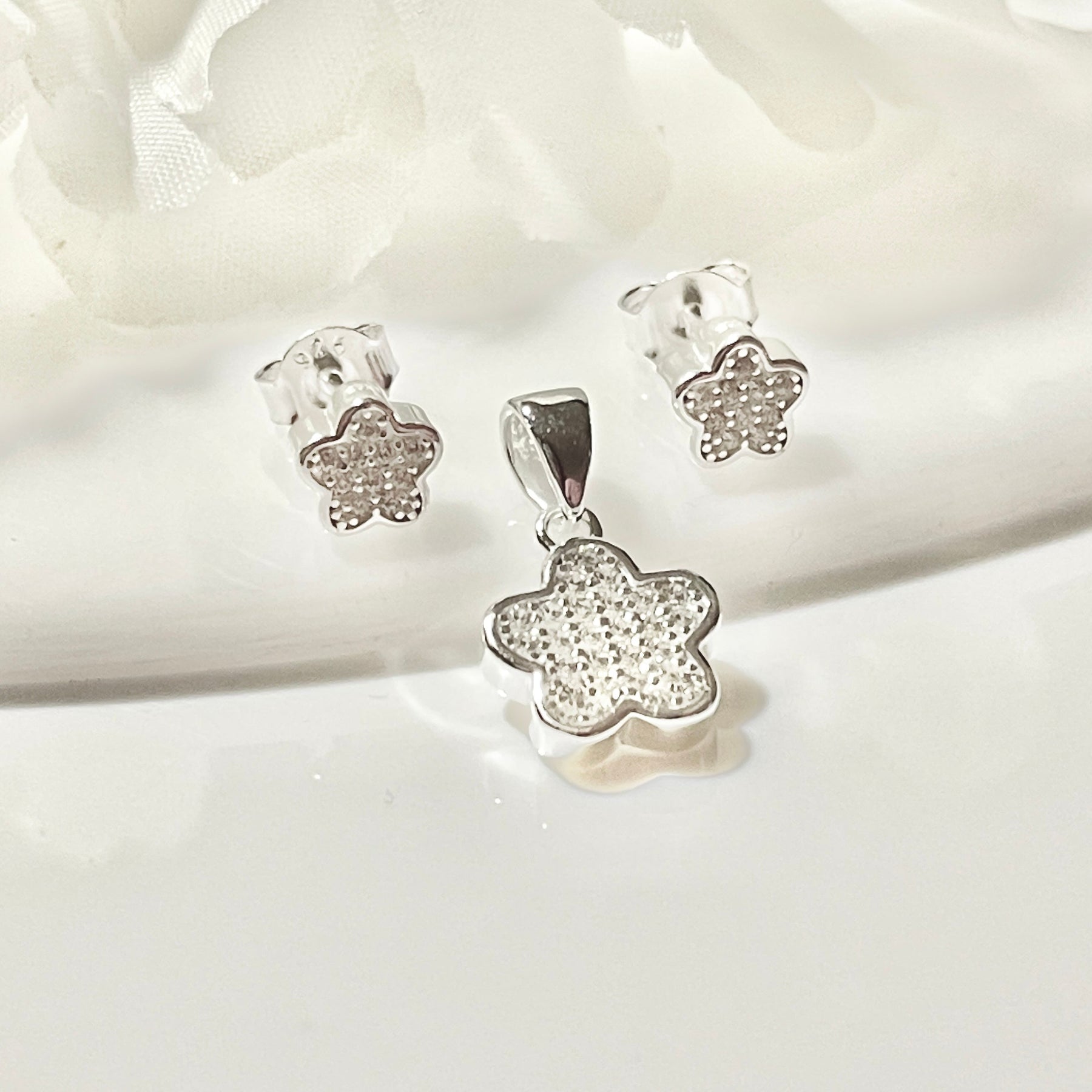 Haz una declaración con este impresionante conjunto de plata. Los aretes y el colgante son impresionantemente hermosos, el diseño de flor brillo blanca es llamativo y regio. Los aretes miden 7mm y el colgante 11mm. Tanto si te vistes para una ocasión especial como si simplemente acentúas tu estilo diario, este conjunto de plata seguro que te impresionará.