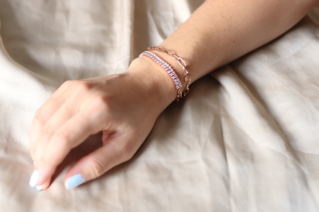 ¡Te presentamos la pulsera doble! Esta hermosa pieza es perfecta para añadir un toque de lujo a cualquier conjunto. Fabricada con una aleación de metal y chapada en oro rosa de 14k, tiene una longitud de 19 cm con una extensión extra de 5 cm. La pulsera de eslabones ovalados está adornada con piedras de circonita rectagulares, que brillan y captan la luz de forma maravillosa. Tanto si la llevas sola como si la apilas con otras pulseras, esta pulsera dará que hablar.