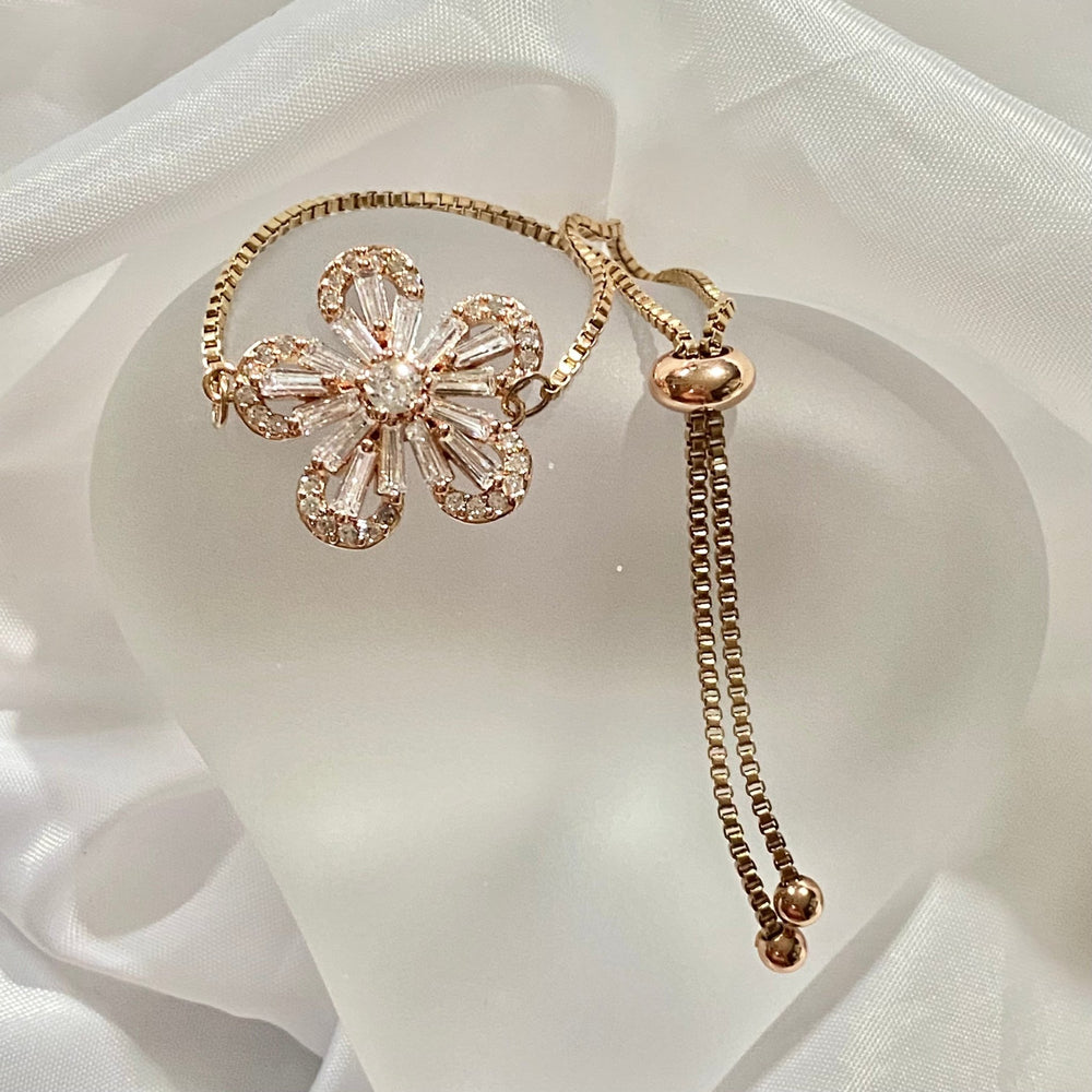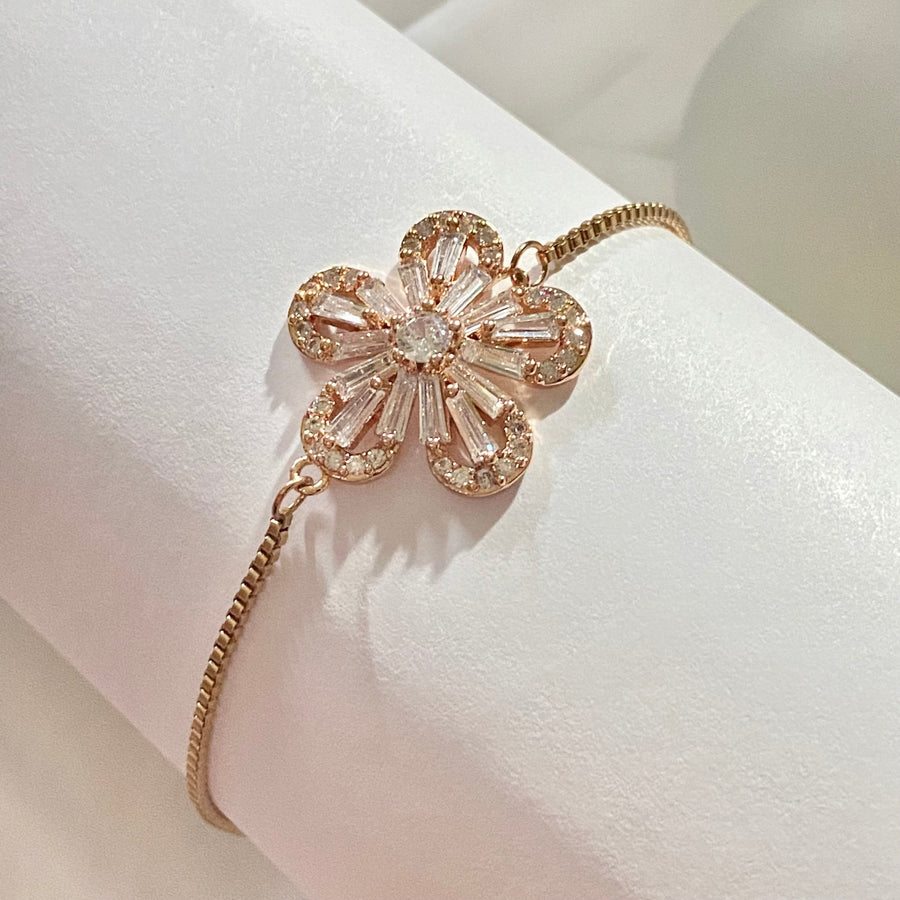 Esta bonita pulsera es ajustable para adaptarse a cualquier tamaño de mano, lo que la convierte en el regalo perfecto para cualquier mujer especial de tu vida. Está hecha de una aleación de metal con un baño de oro rosa, y en el centro de la pulsera hay un dije con forma de flor grande. La flor está adornada con brillantes piedras de circonita blanca, que añaden un toque extra de elegancia.