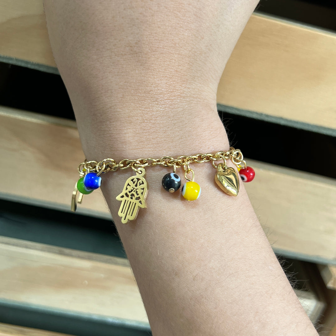 • Pulsera acero inoxidable con varios Dijes de Mano Fátima,Herradura,Corazón,Trébol