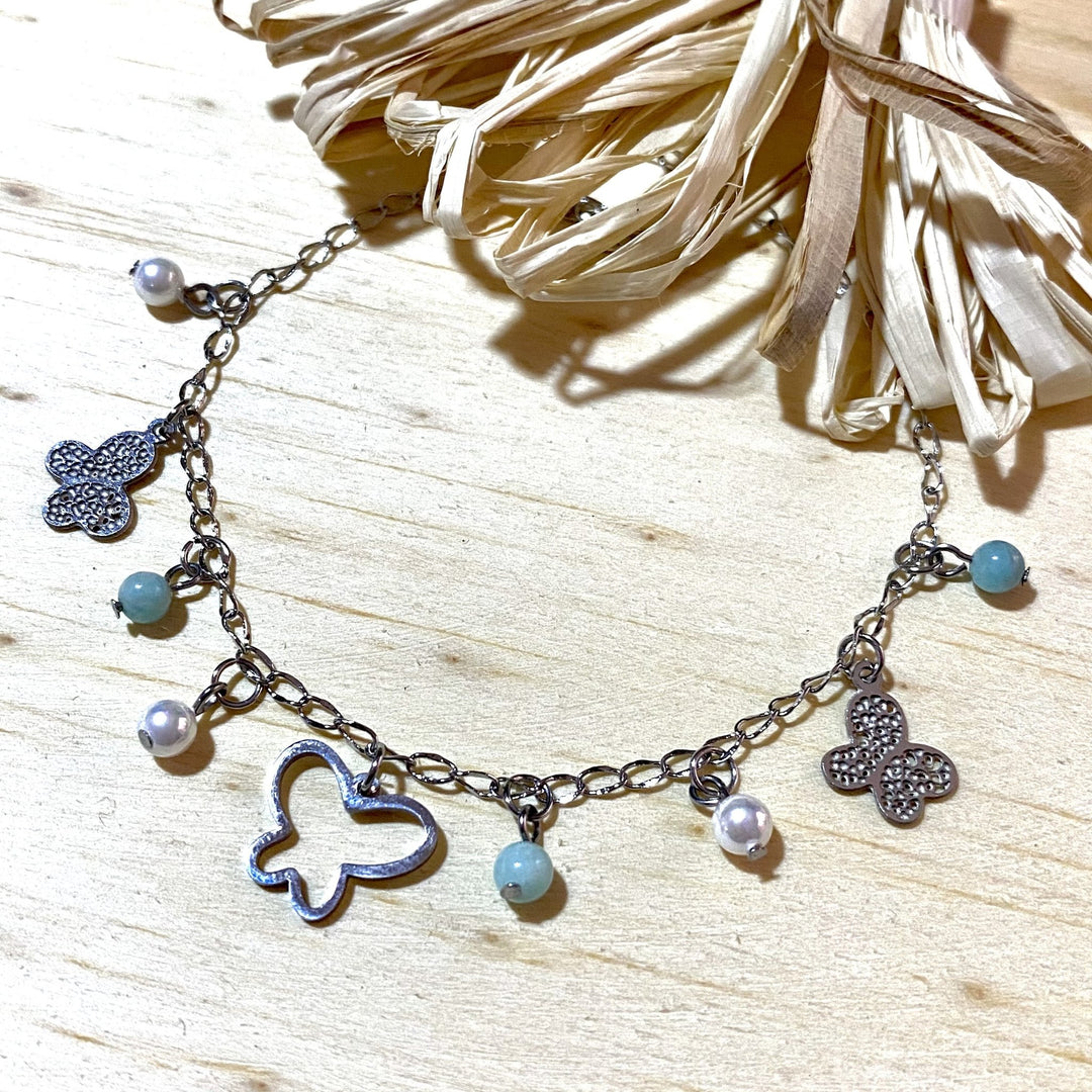 Pulsera de acero inoxidable con aleación plateada con dijes de mariposas y perlas.