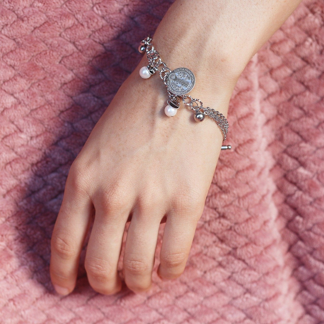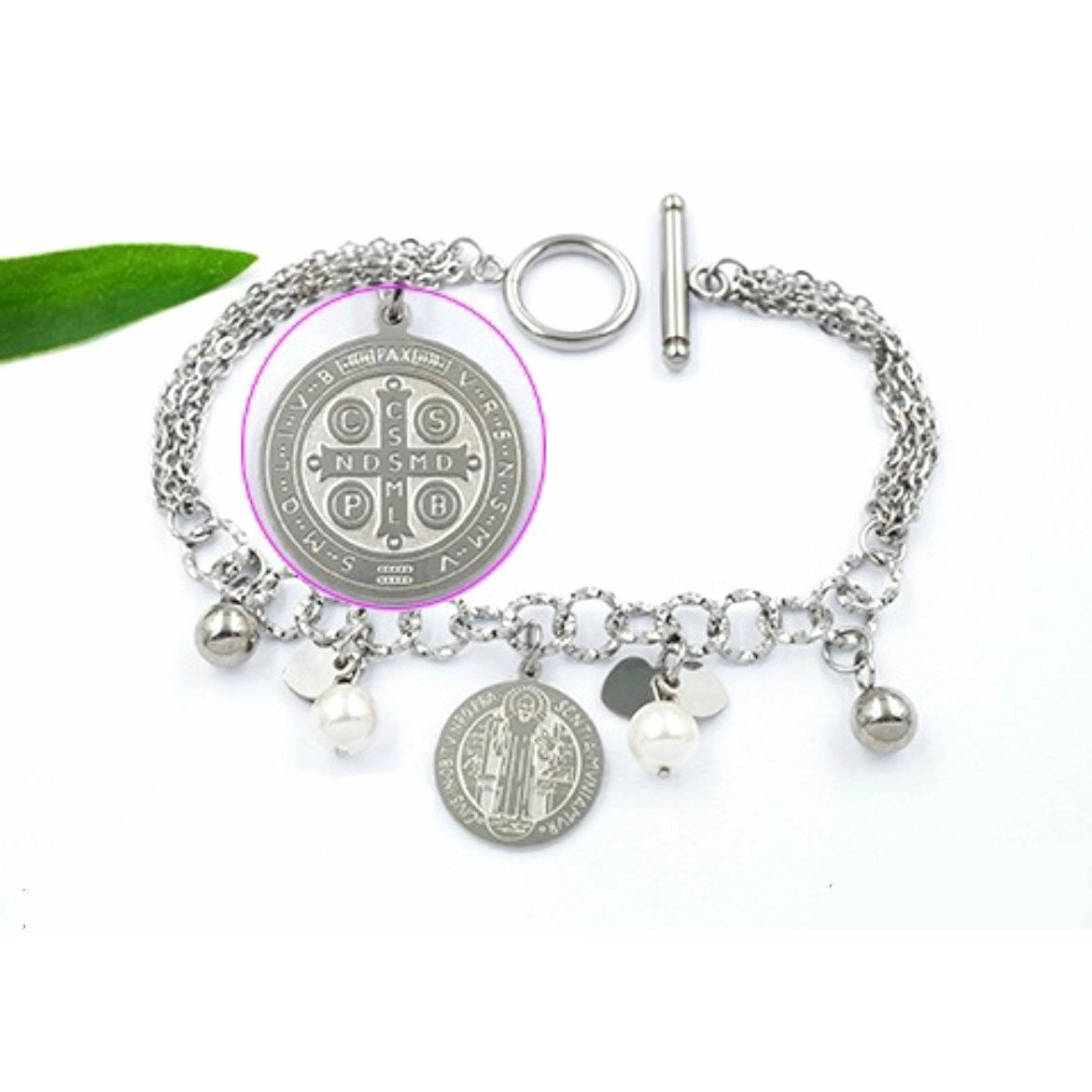 Pulsera de acero inoxidable plateada con dije de San Benito.