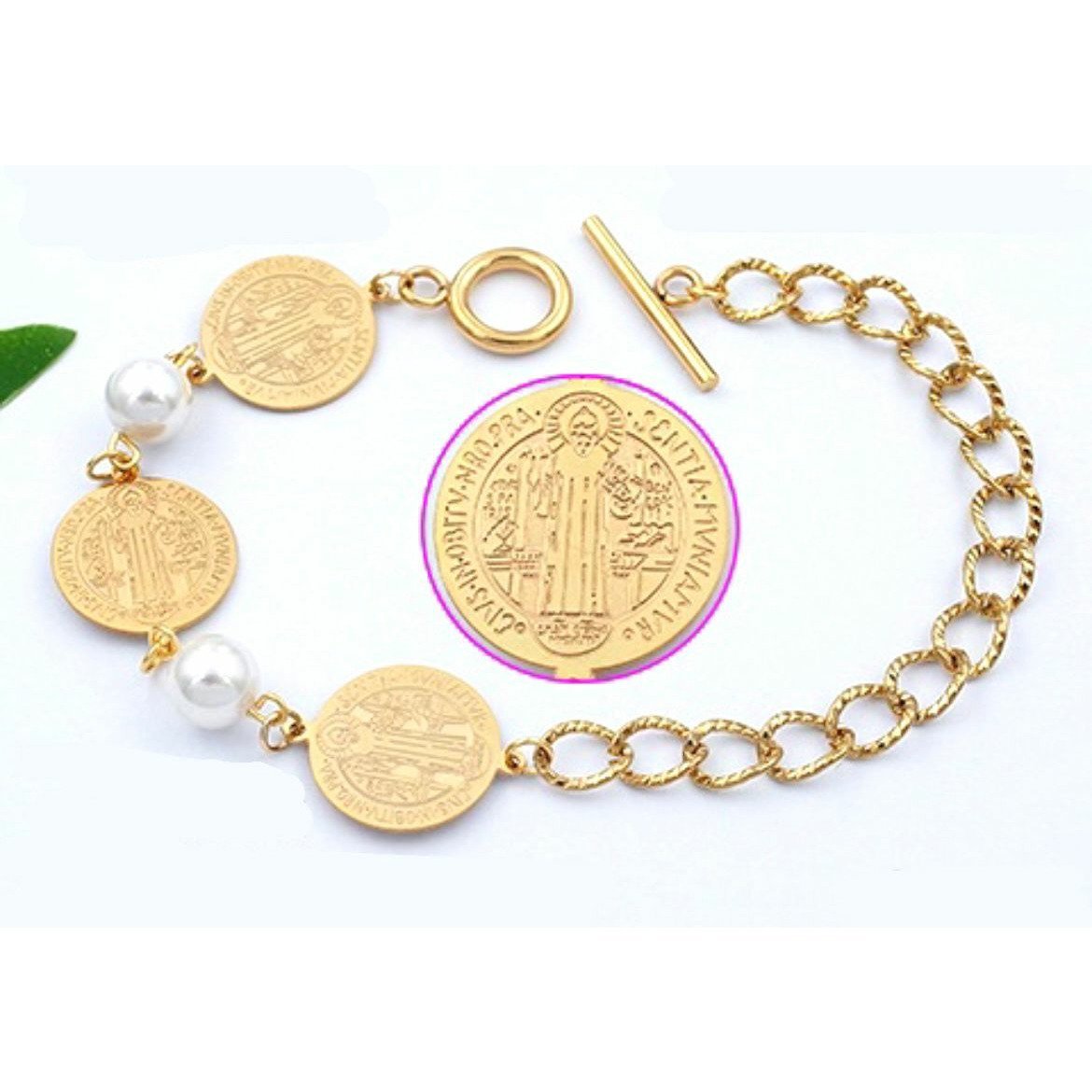 Pulsera de acero inoxidable con aleación dorada con dijes de San Benito.