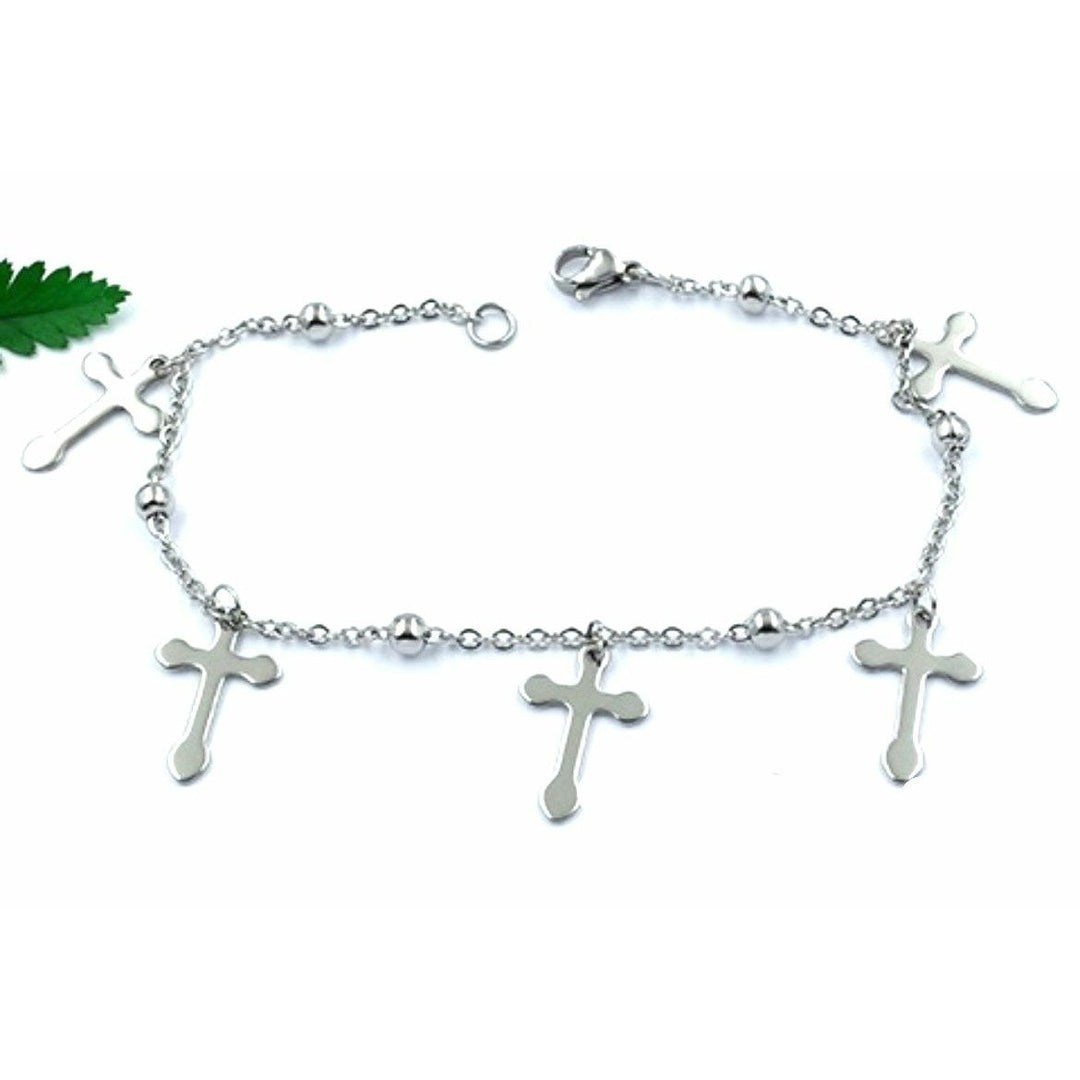 Pulsera de acero inoxidable con aleación plateado con dijes de cruz.