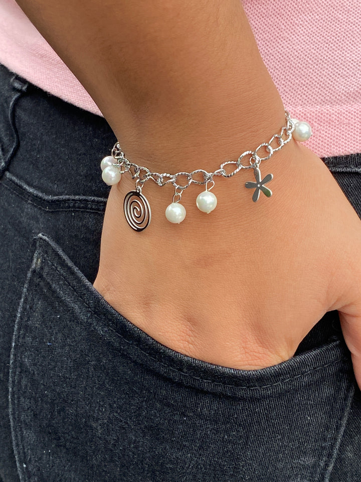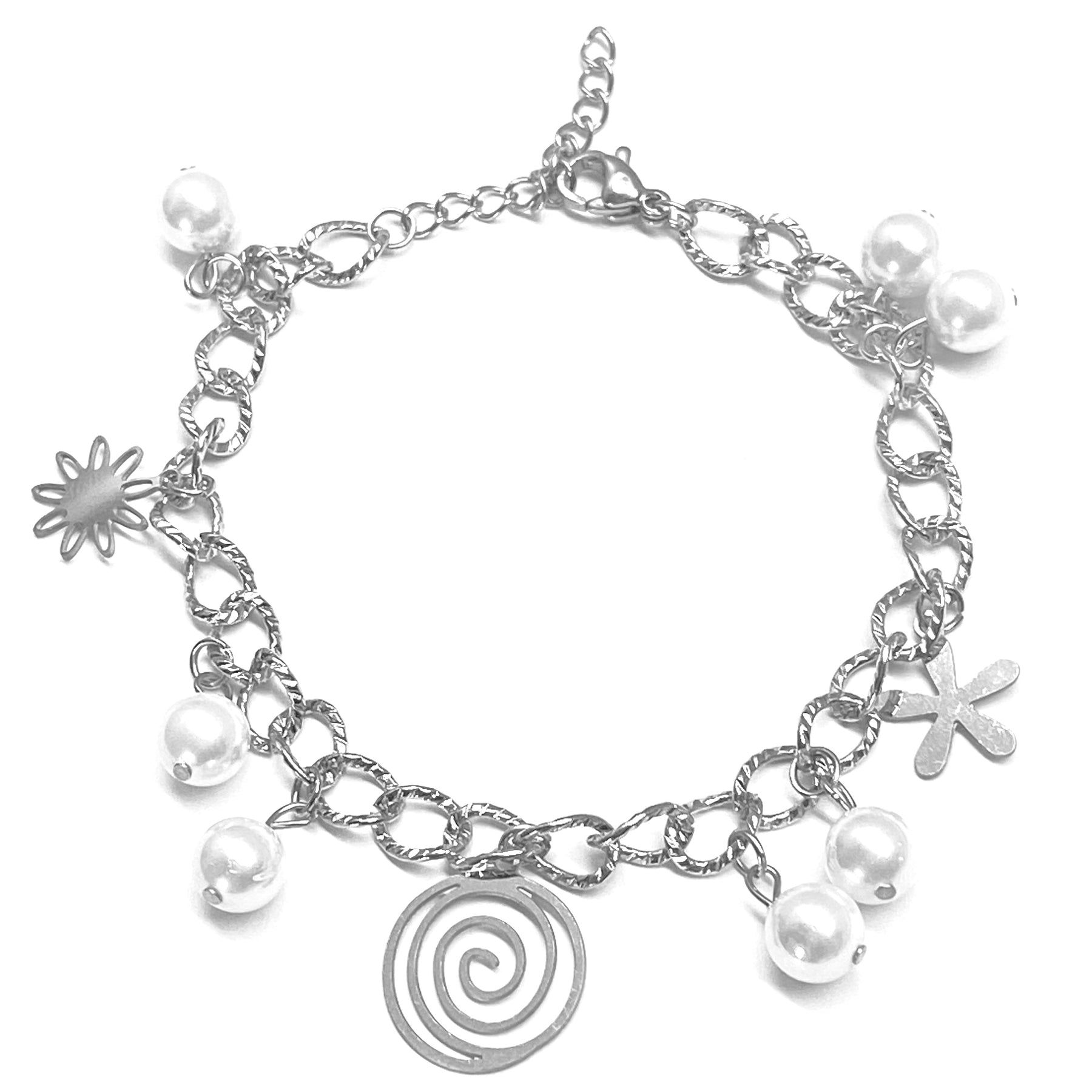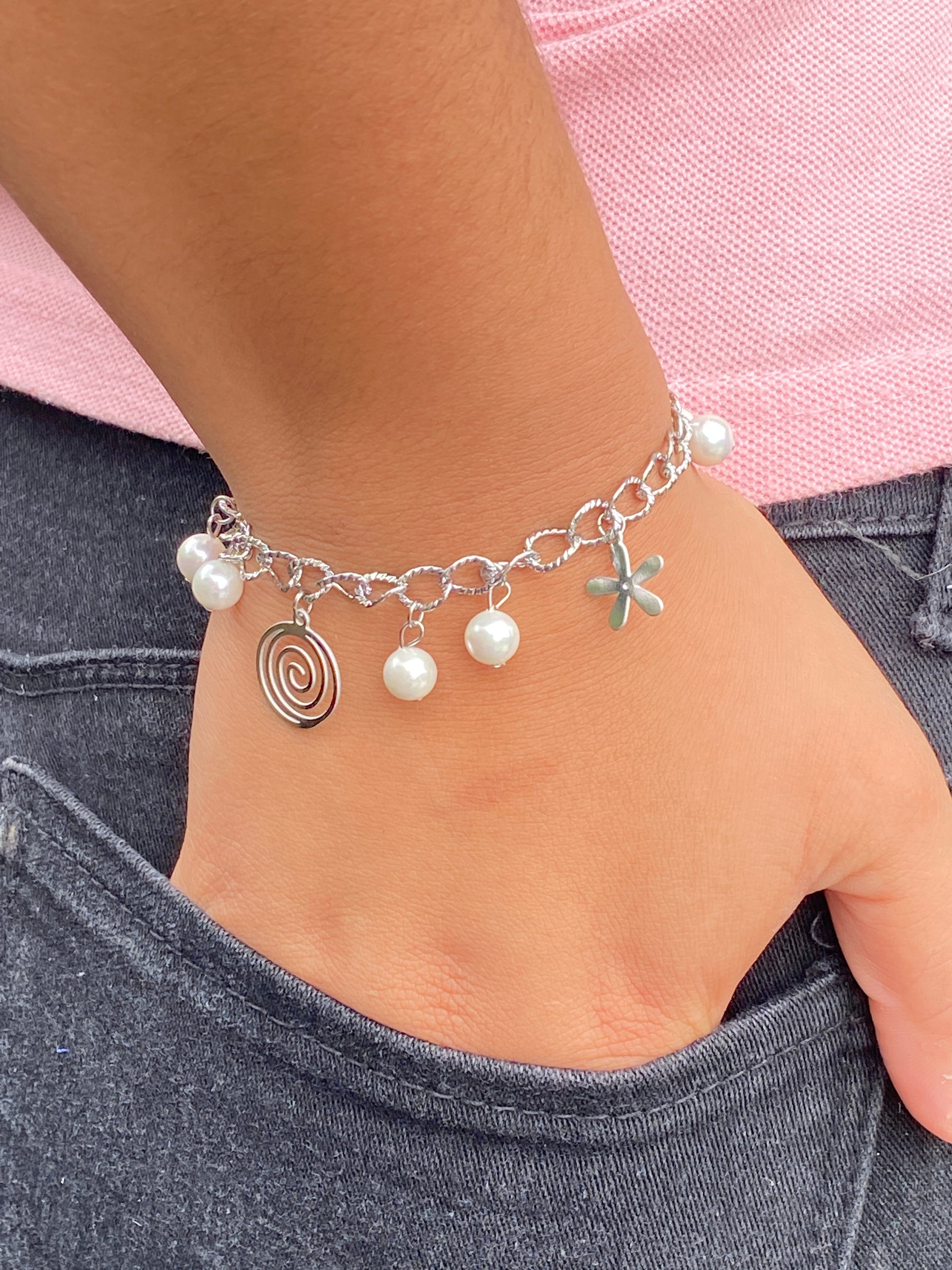 • Pulsera de acero inoxiadable plateada con dijes de Flores