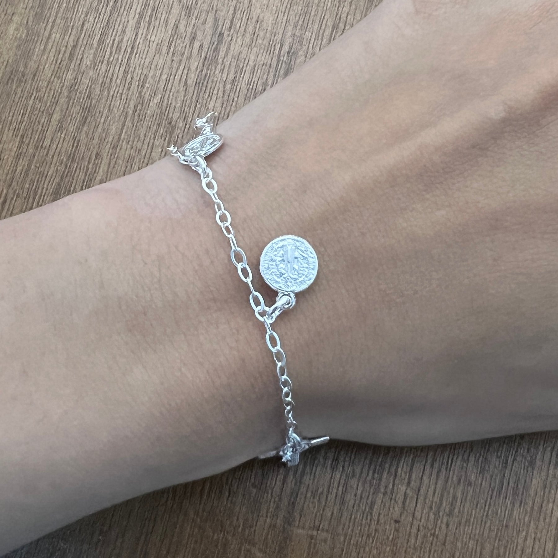 Esta hermosa pulsera tipo rosario de plata 925 es un elemento imprescindible en cualquier colección de joyas. Fabricada en plata de alta calidad, esta pulsera tipo rosario mide 17CM de longitud y presenta un hermoso diseño.