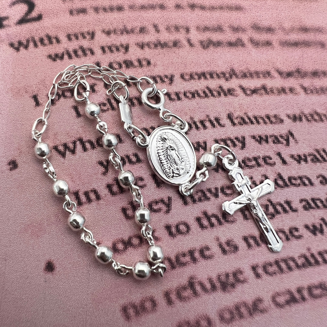 Esta hermosa pulsera tipo rosario de plata 925 es un elemento imprescindible en cualquier colección de joyas. Fabricada en plata de alta calidad, esta pulsera tipo rosario mide 18CM de longitud y 4MM Bolas presenta un hermoso diseño.