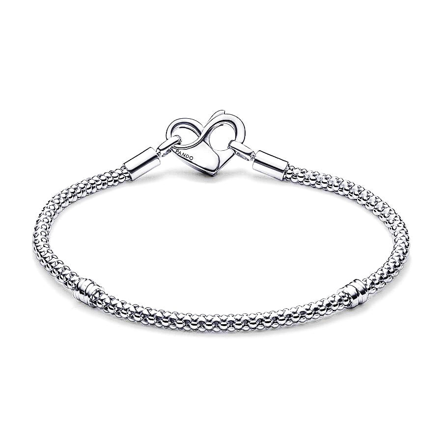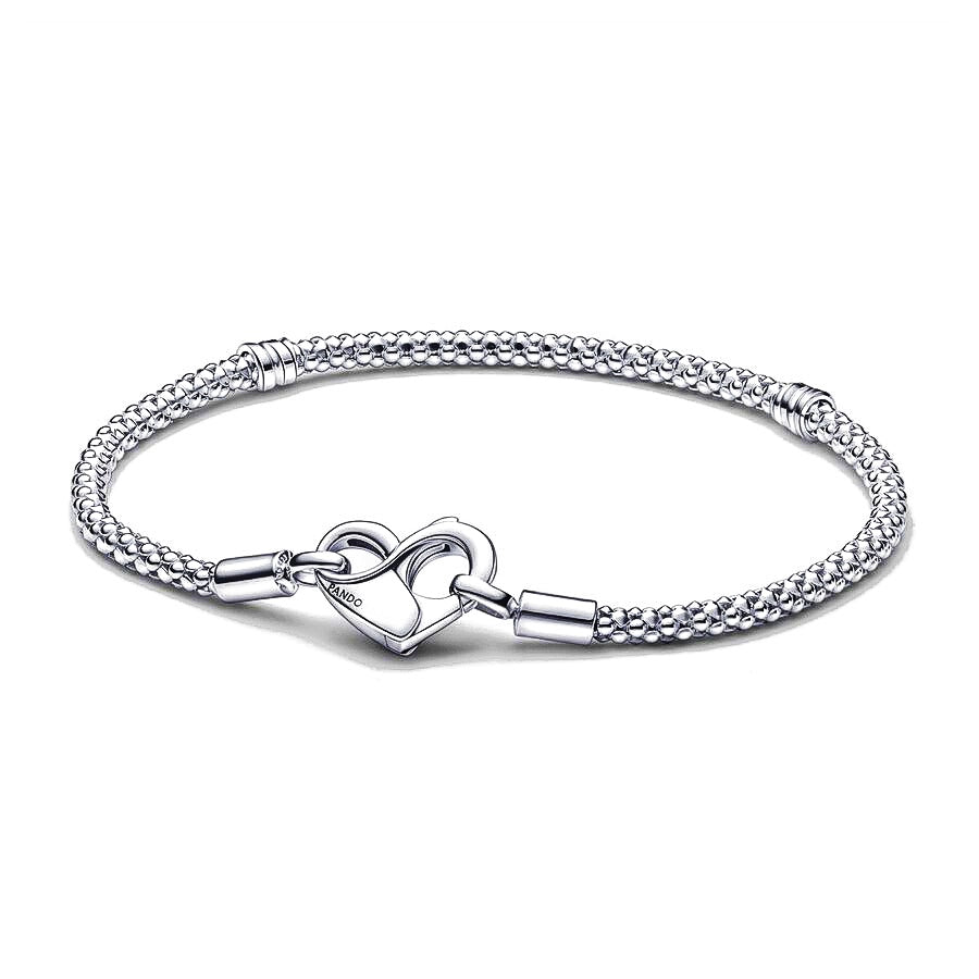 Actualiza tu colección con nuestra nueva pulsera de cadena con tachuelas Pandöra Moments. Esta pulsera, acabada a mano en plata de ley, presenta una cadena texturizada flexible y un broche en forma de corazón que se puede abrir con detalles de infinito y un símbolo de infinito y un símbolo de infinito en el interior.