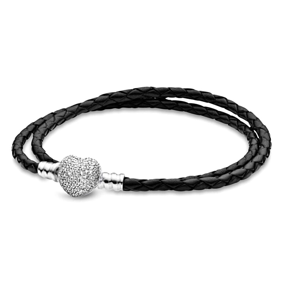 Pulsera de cuero negro de dos vueltas con cierre de plata 925 corazón y logo completo PANDÖRA.