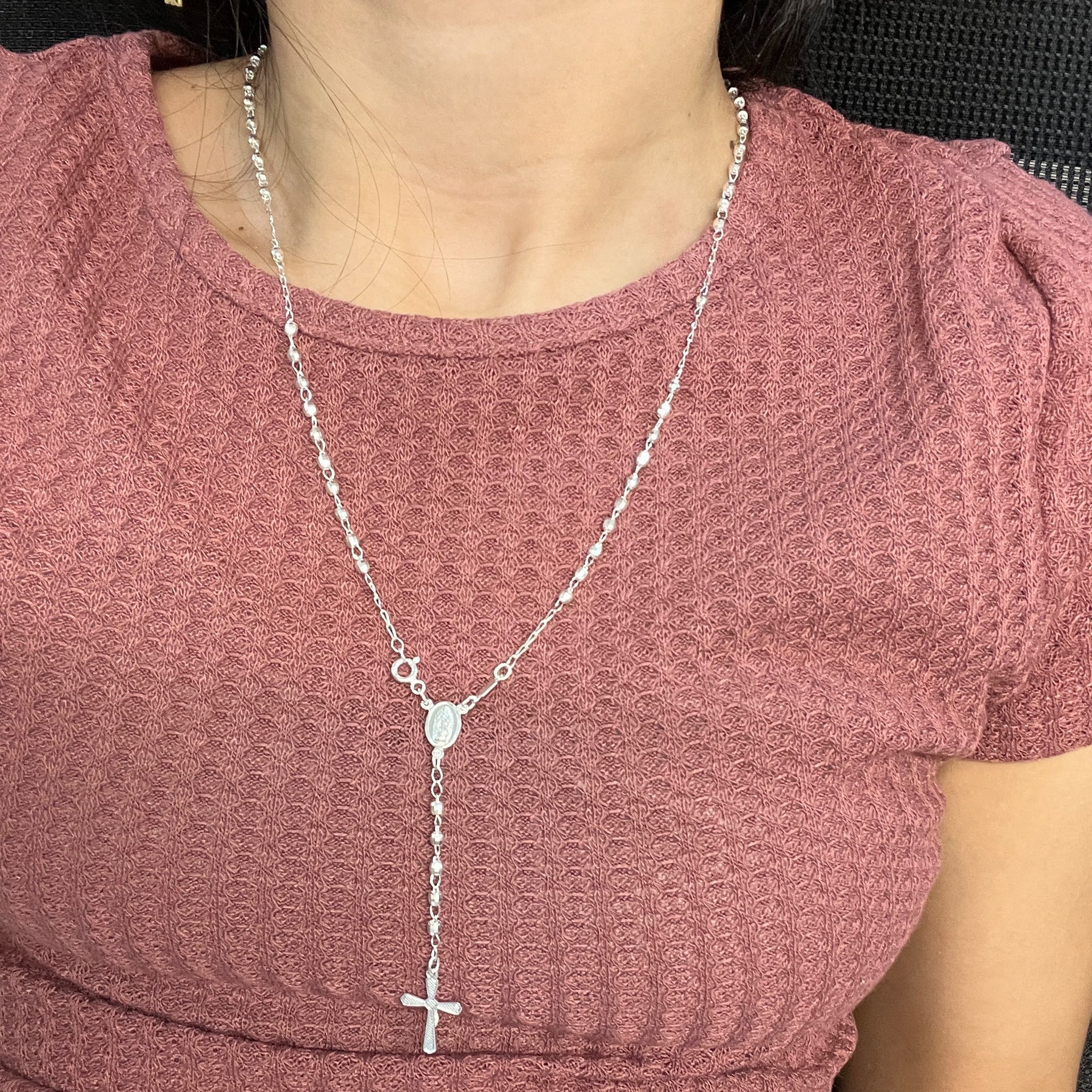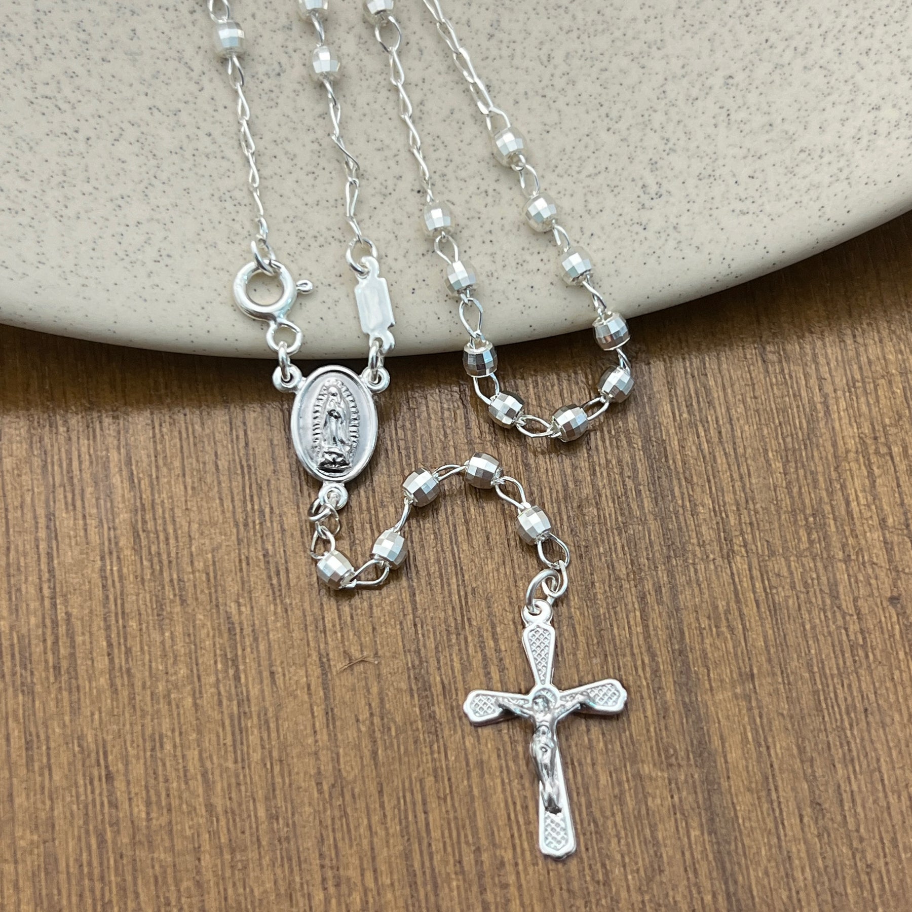 BOLA DECORADA. Este rosario está hecho de plata 925 y mide 50 cm de largo. Tiene los 5 misterios del Rosario, por lo que es una forma perfecta de rezar. La medalla de virgen es también un toque especial que hace que este rosario sea aún más especial.
