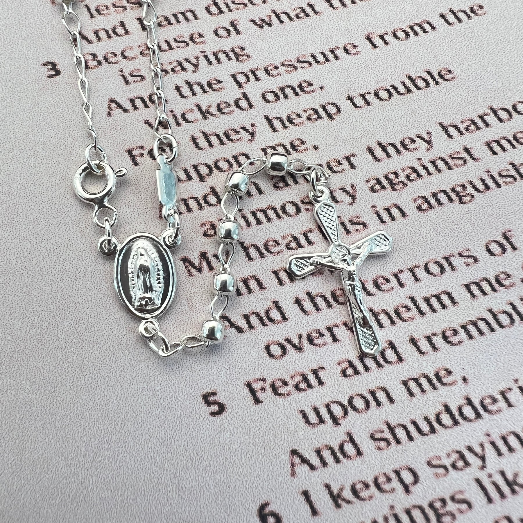 BOLA LISA. Está hecho de plata 925, y las bolas son de 3MM. La longitud del rosario es de 50cm, y viene con una medalla de San Benito. Este rosario se puede utilizar para rezar porque tiene los 5 misterios.