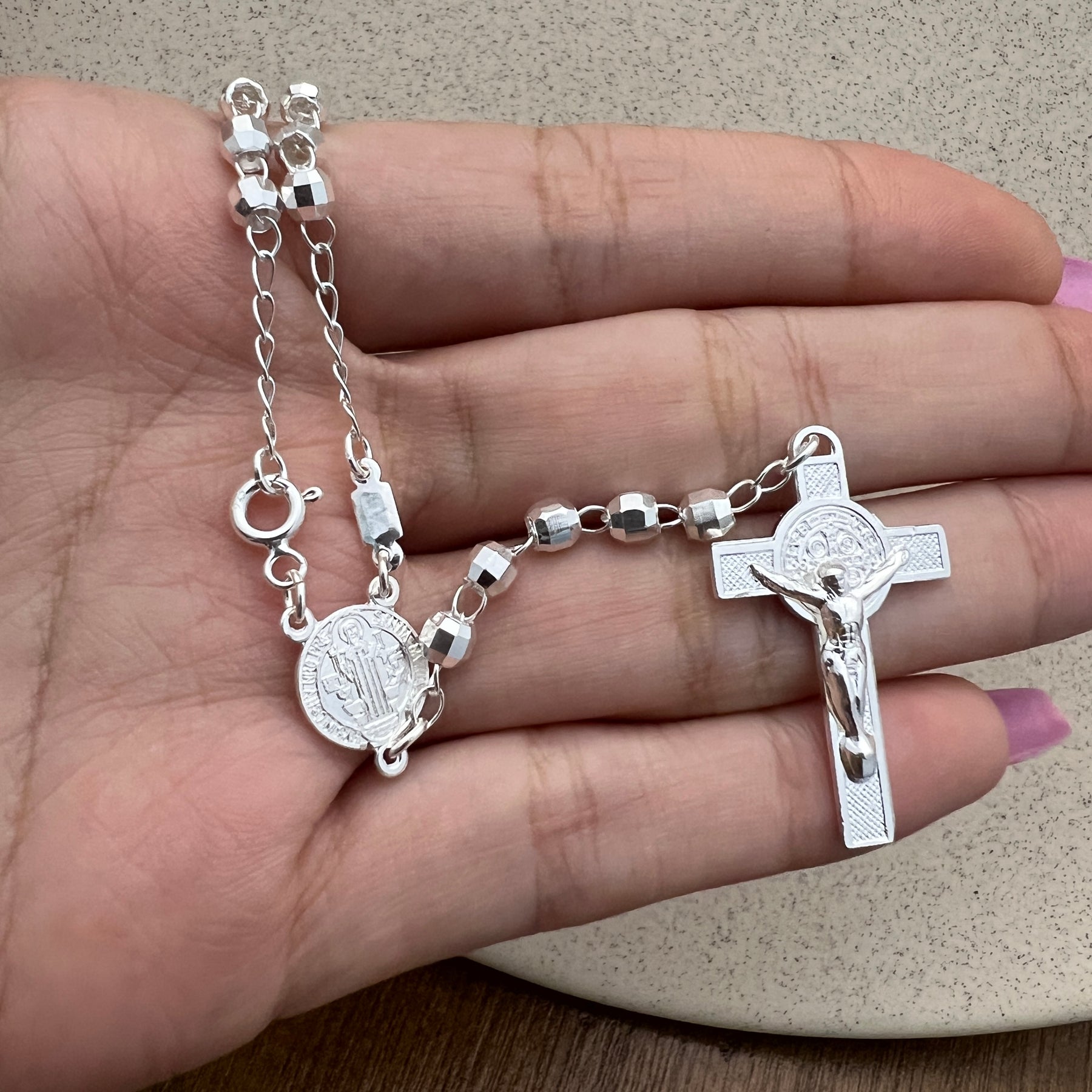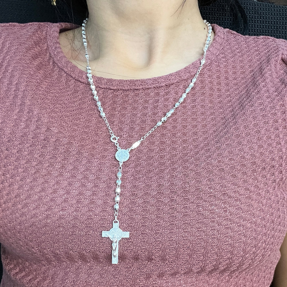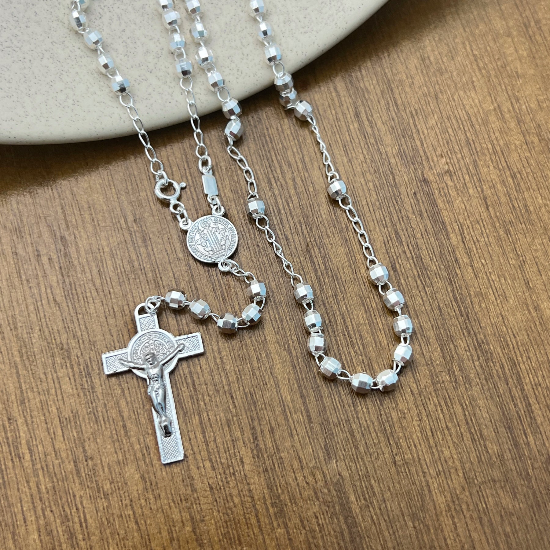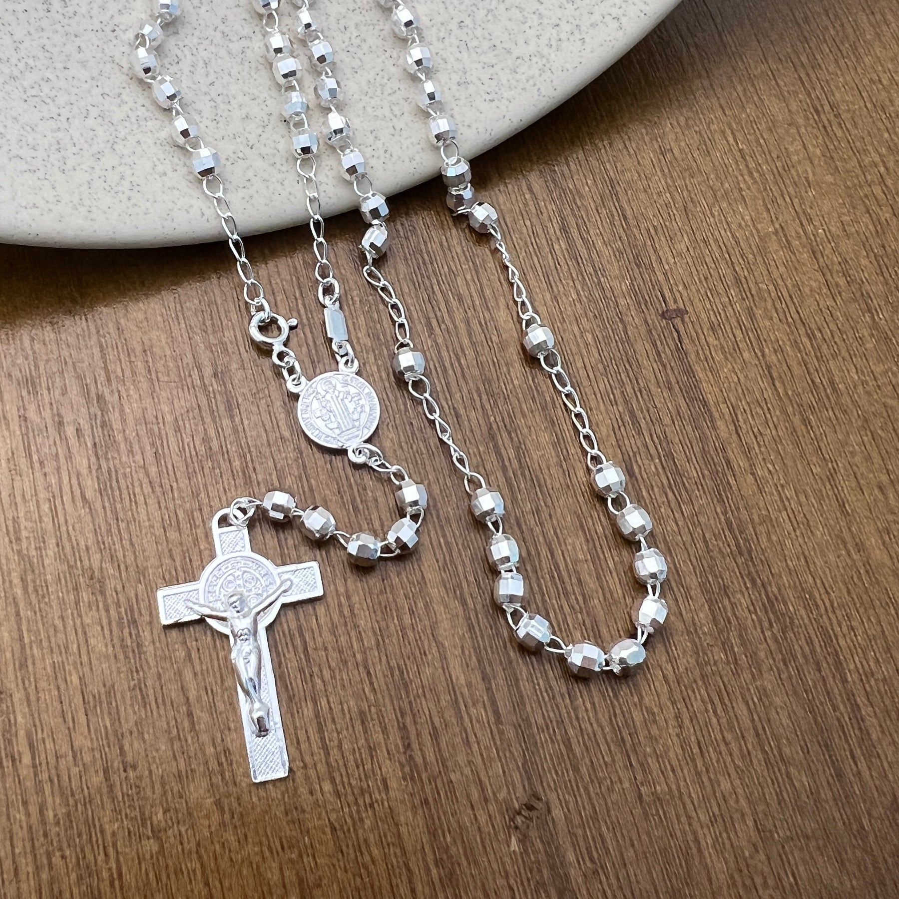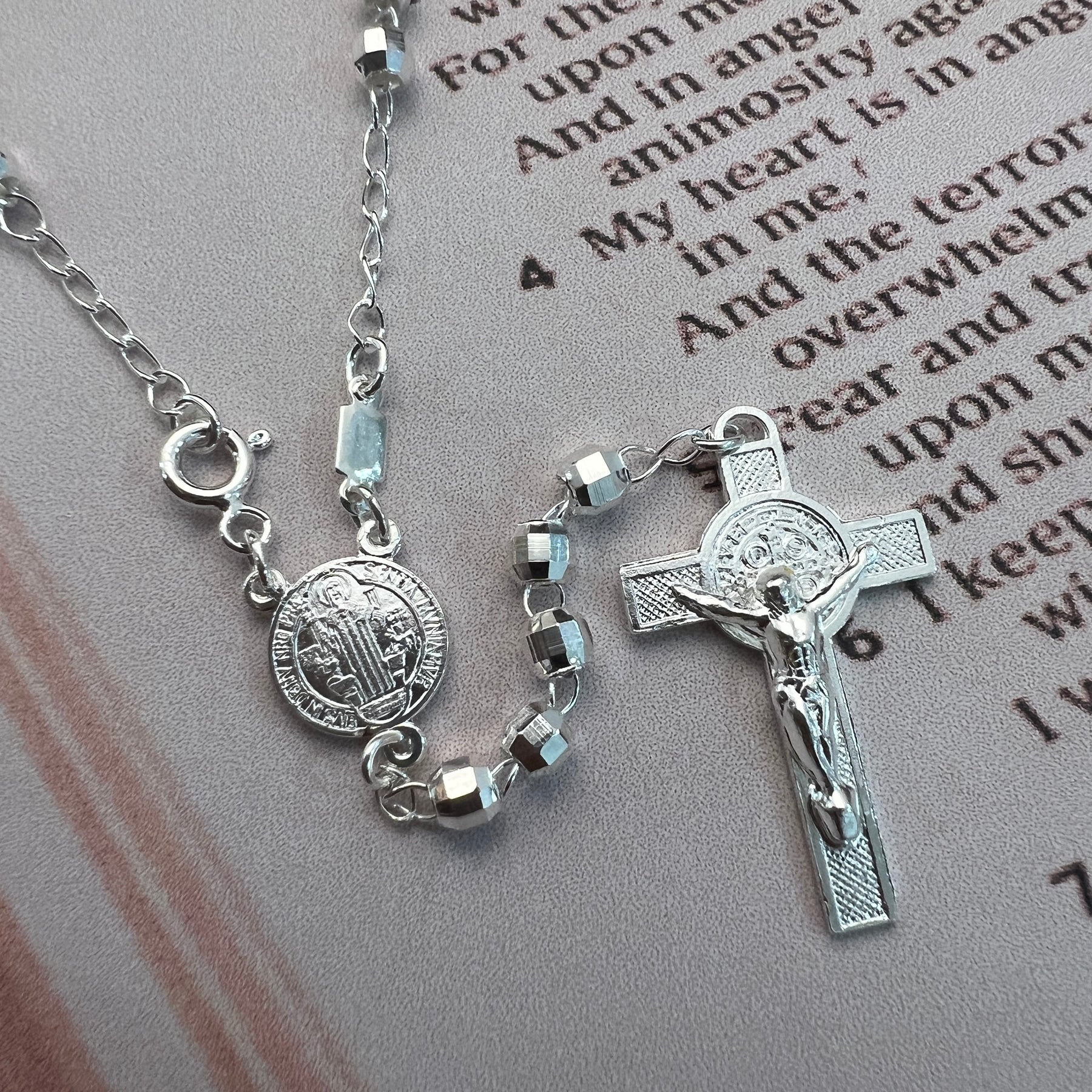 El rosario de plata es una hermosa y sagrada pieza de joyería que puede utilizarse como una poderosa herramienta para la oración. Este rosario está hecho de plata 925, con bolas de 3.8mm y una longitud de 50 cm. Viene con una medalla de la San Benito