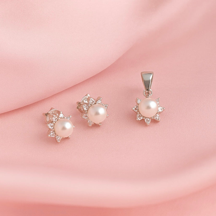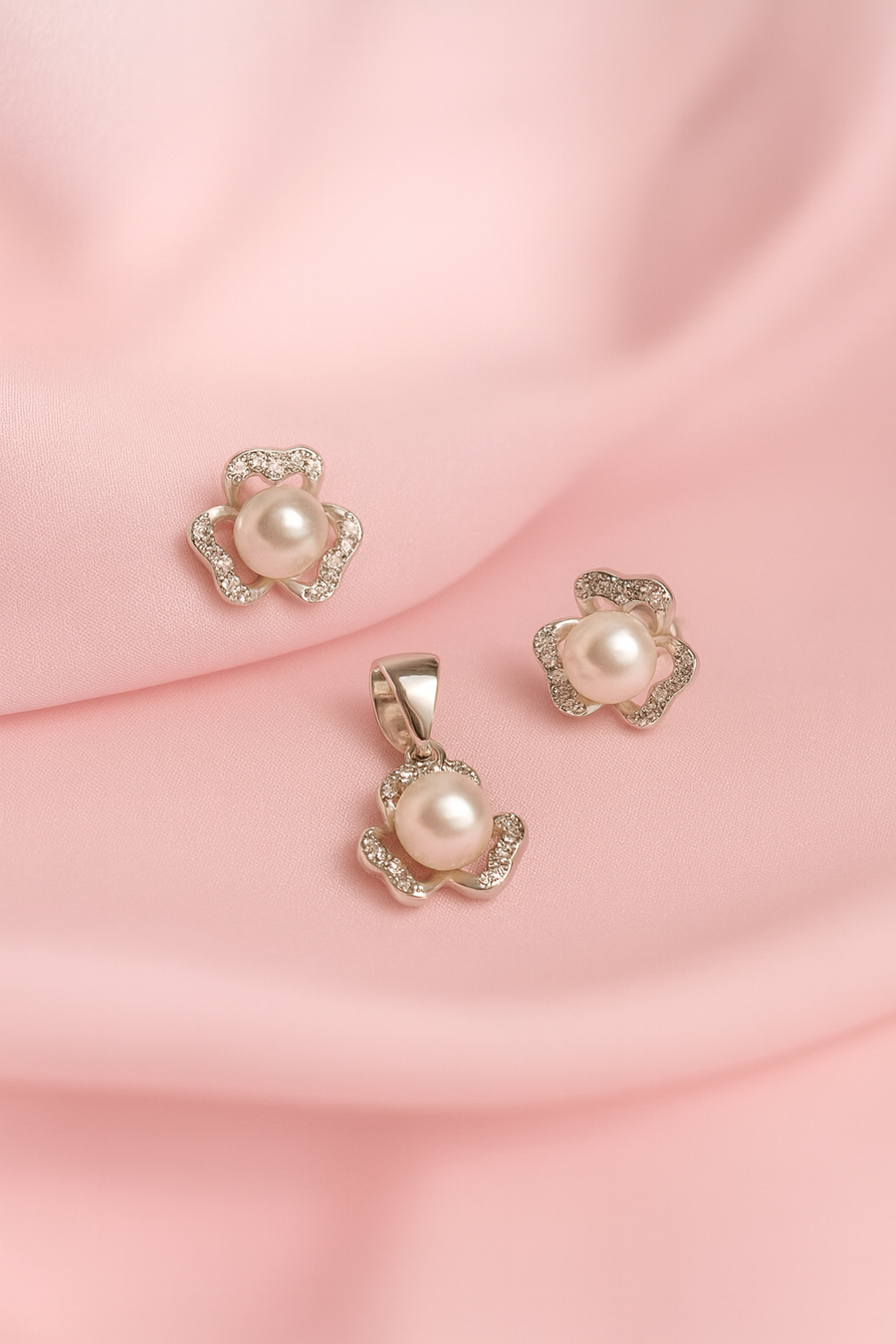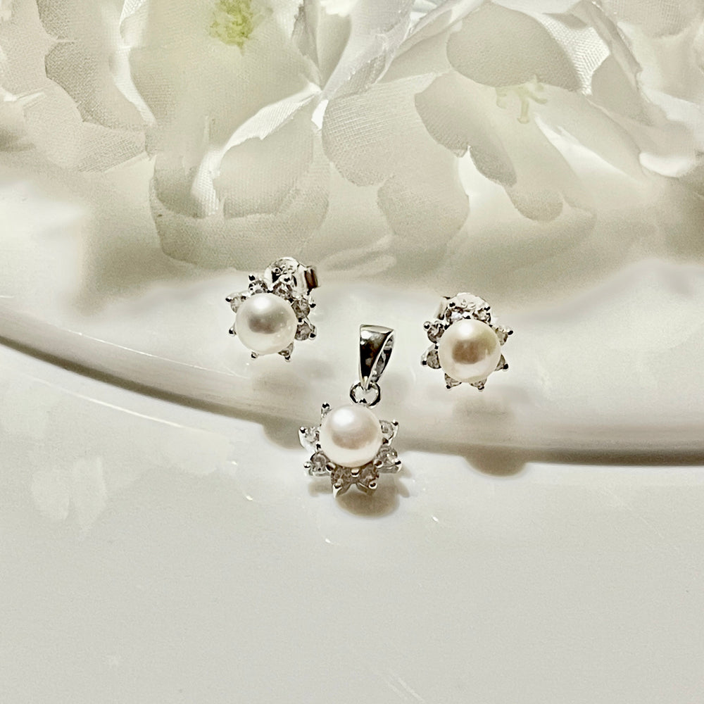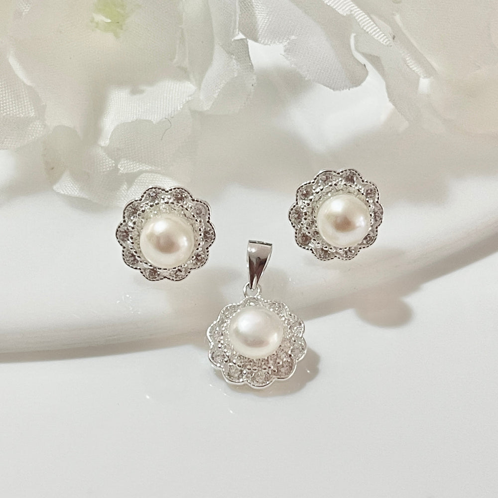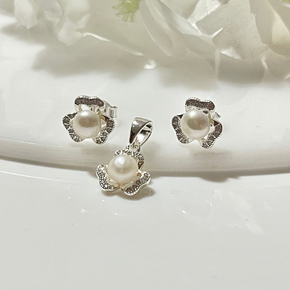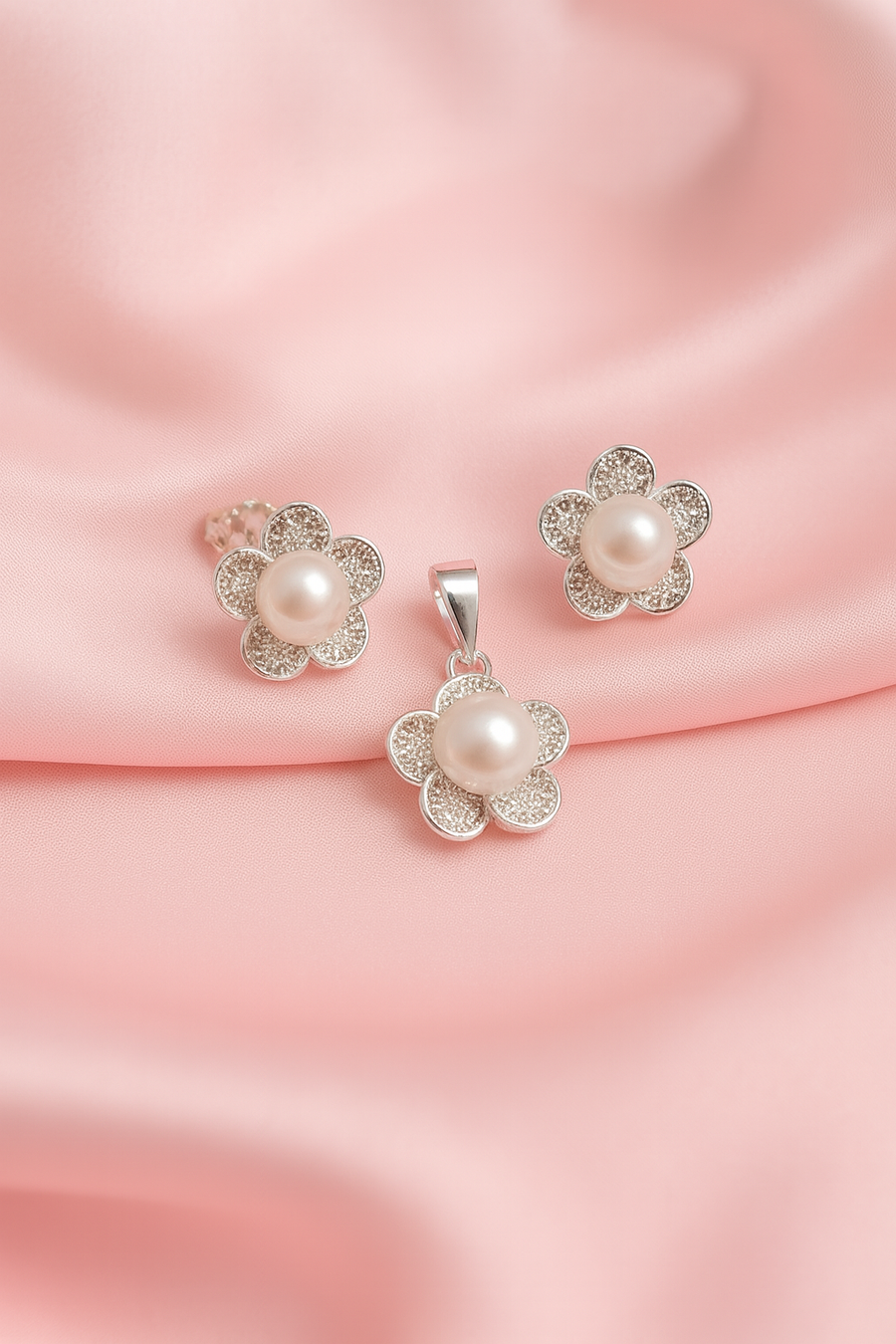 Juego Plata Perlas Flor Cinco Pétalos Grande