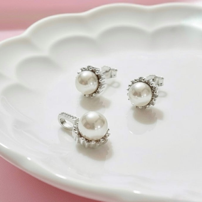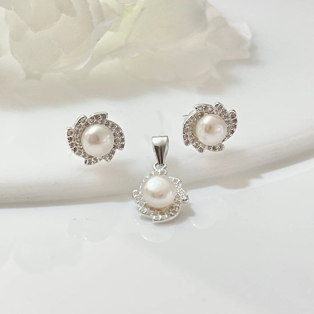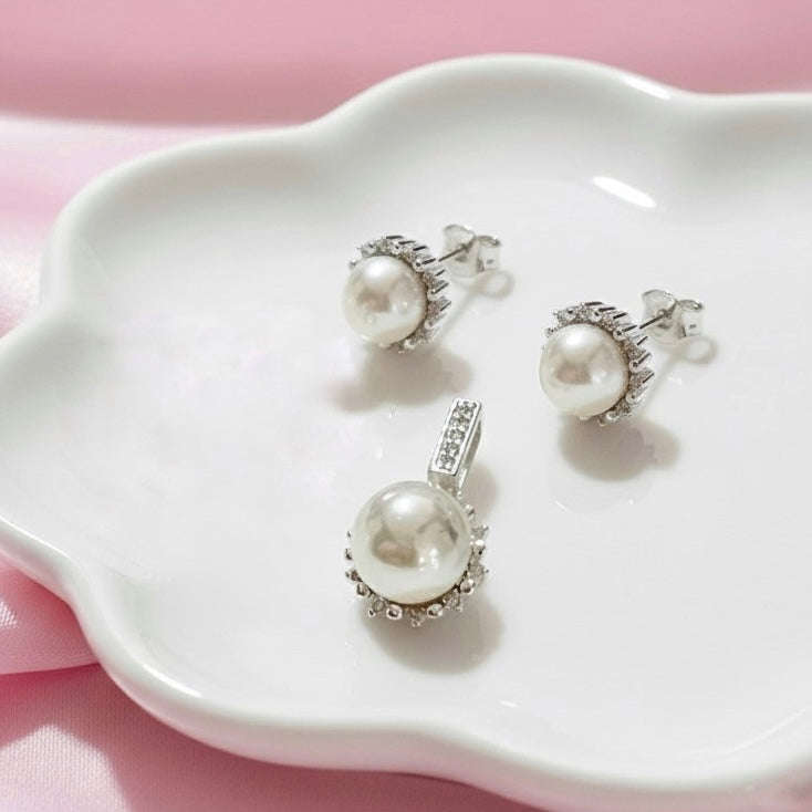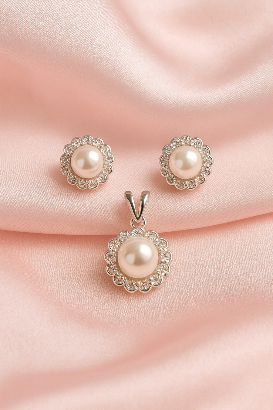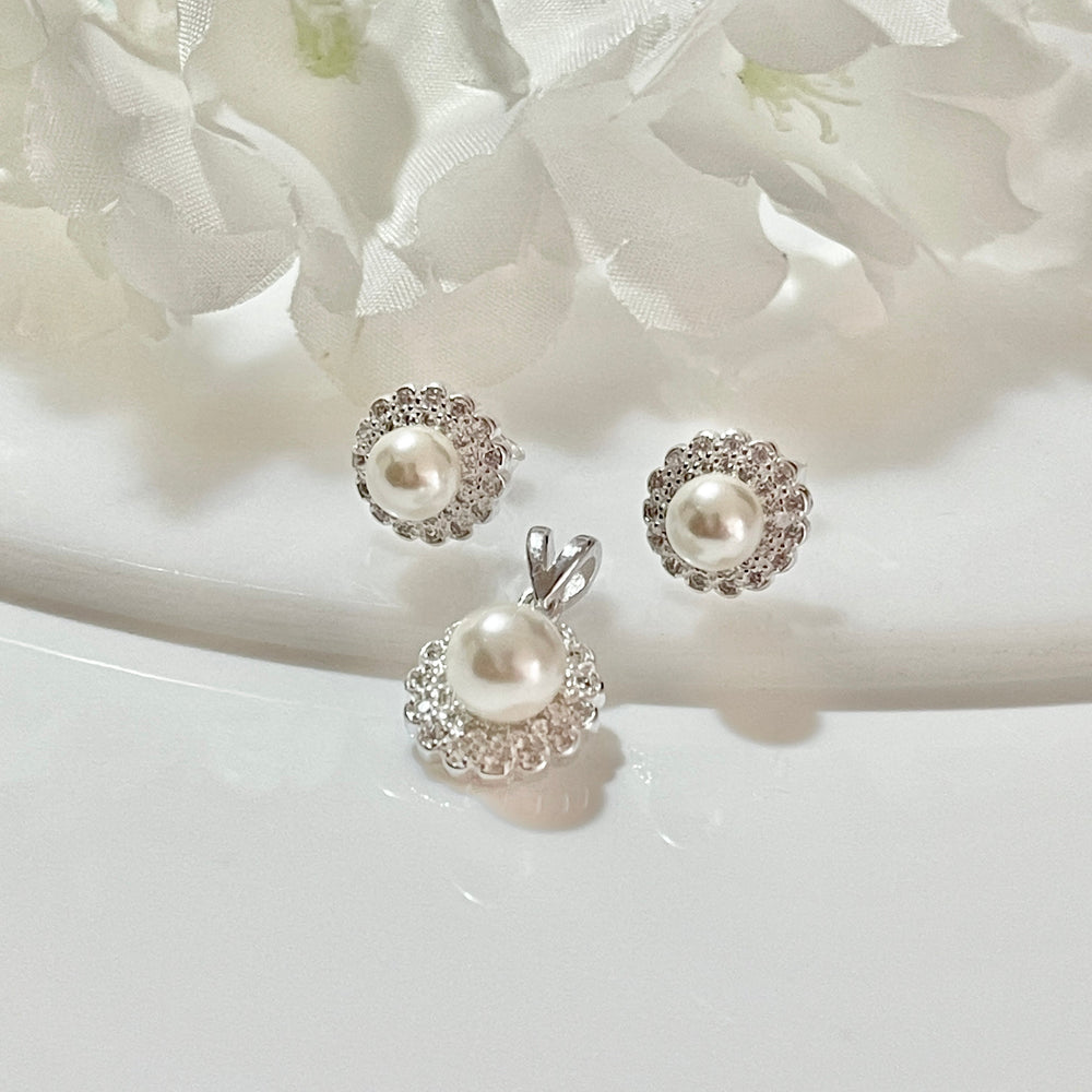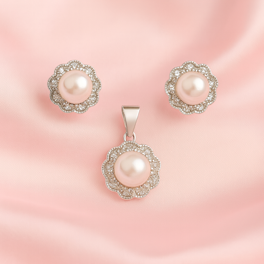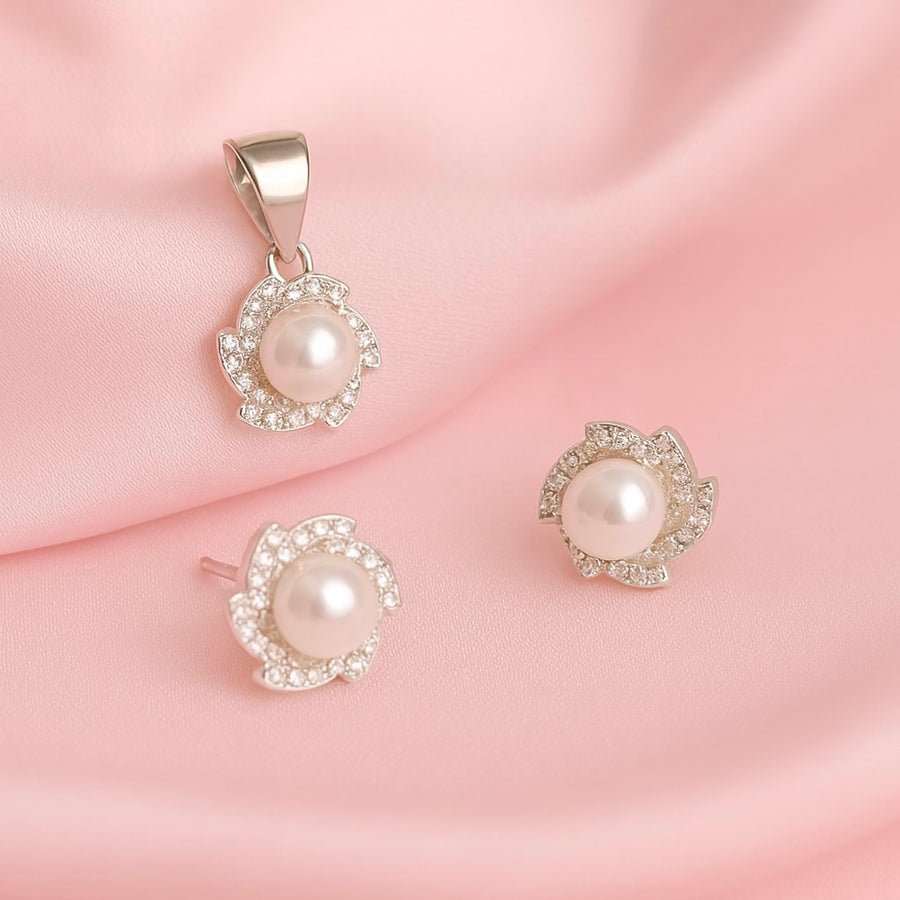Juego Plata Perlas Flor Cinco Pétalos Grande